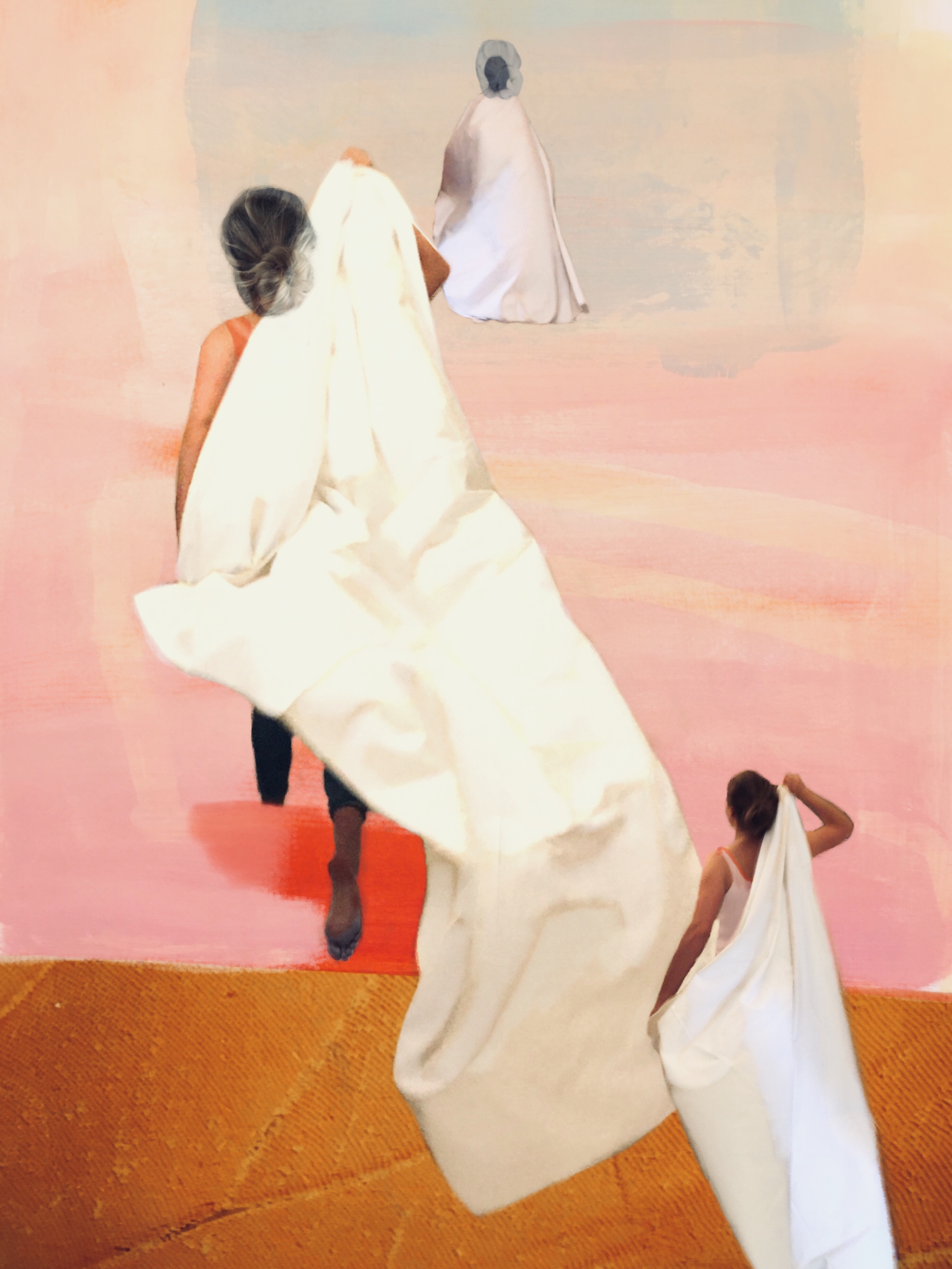 The finished artworks are two-dimensional, but she always sees a three-dimensional room as well, because in her process she sees each digital collage as a little theatre production that tells a story and shows people in imaginary places.
