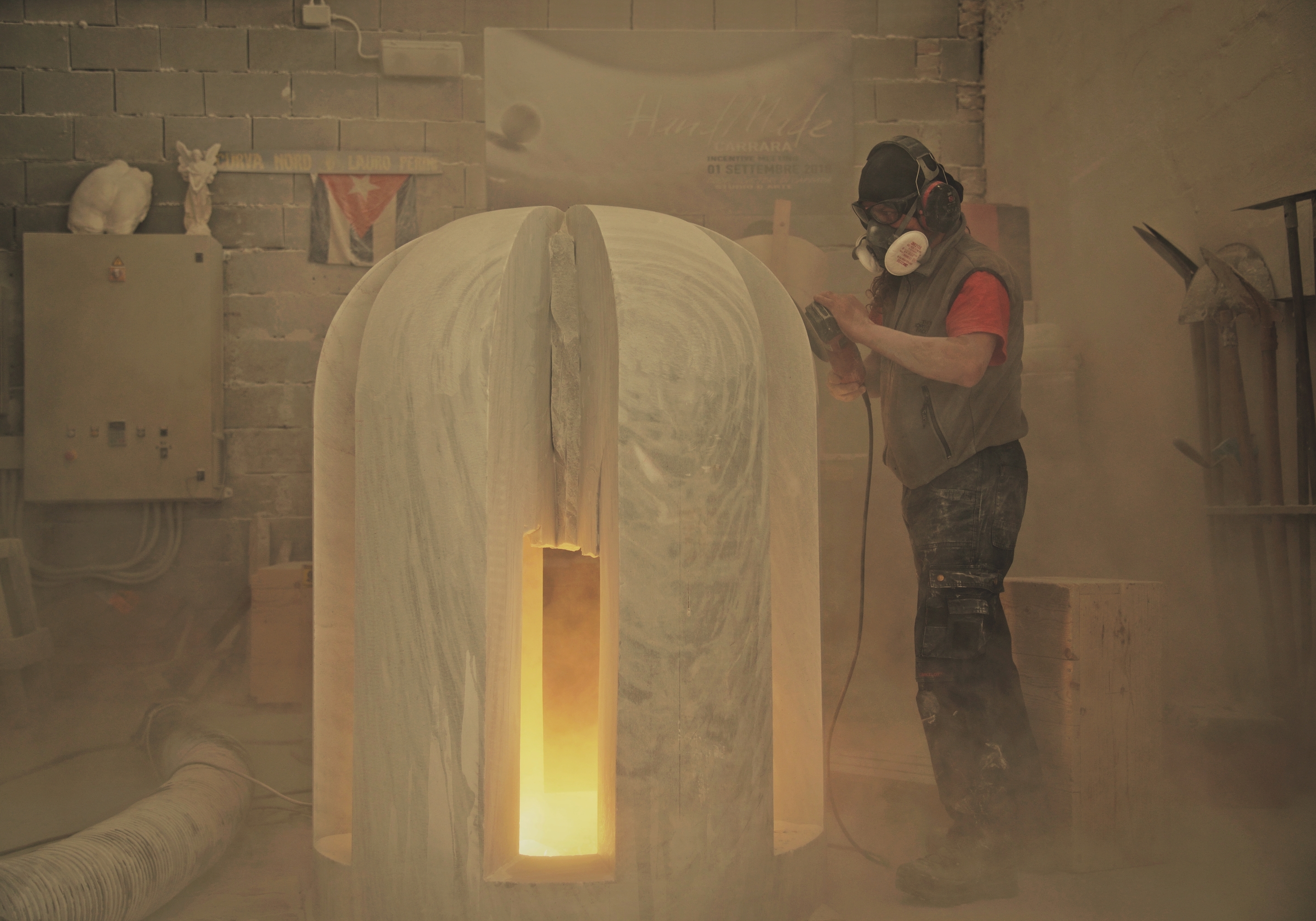 In Simone´s photos we can admire the dedication of these modern sculptors at work, with white dust swirling in the air, lit up by the light streaming through the huge windows and by electric lights gleaming through the translucent stone. He conceived this photographic series, which he calls “Modern Sculptors”, to show how the ancient art of marble sculpting continues to exist and how it has been transformed. Now, the artists working with this fine stone have at their disposal more sophisticate tools than those the ancient sculptors used, but the craft remains an ancient manual skill, essentially still employing mallets and chisels to shape the rocks. It takes many years of training, passed down from generation to generation, from Master to apprentice.