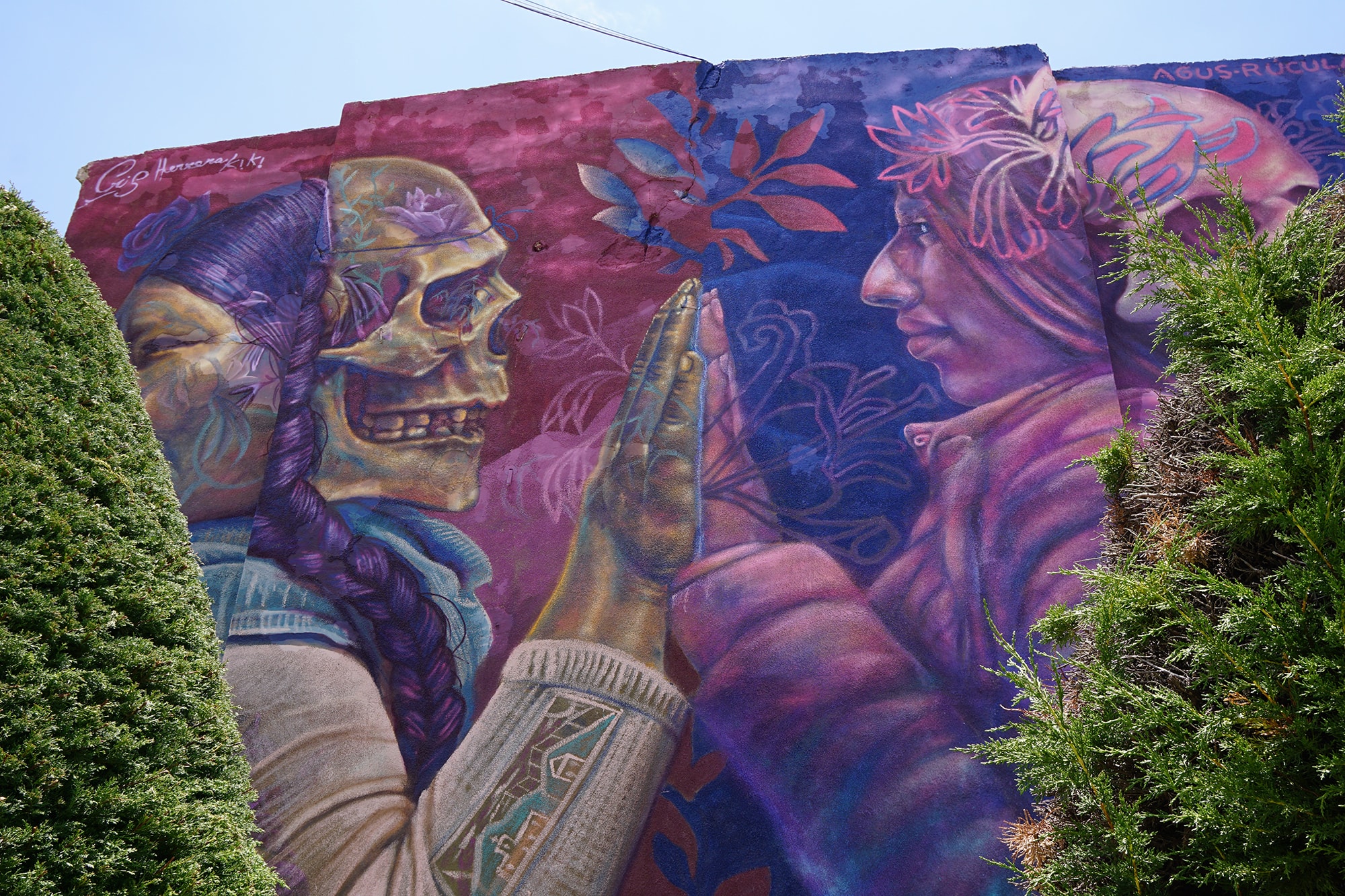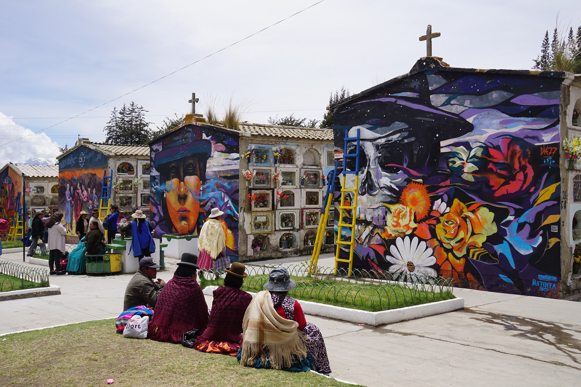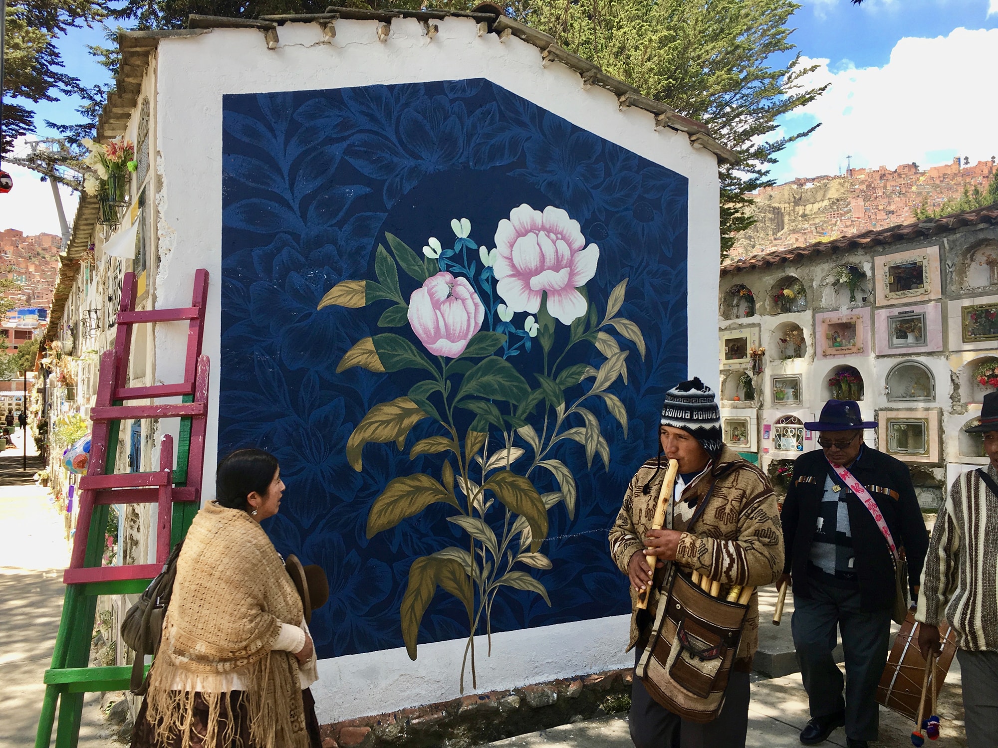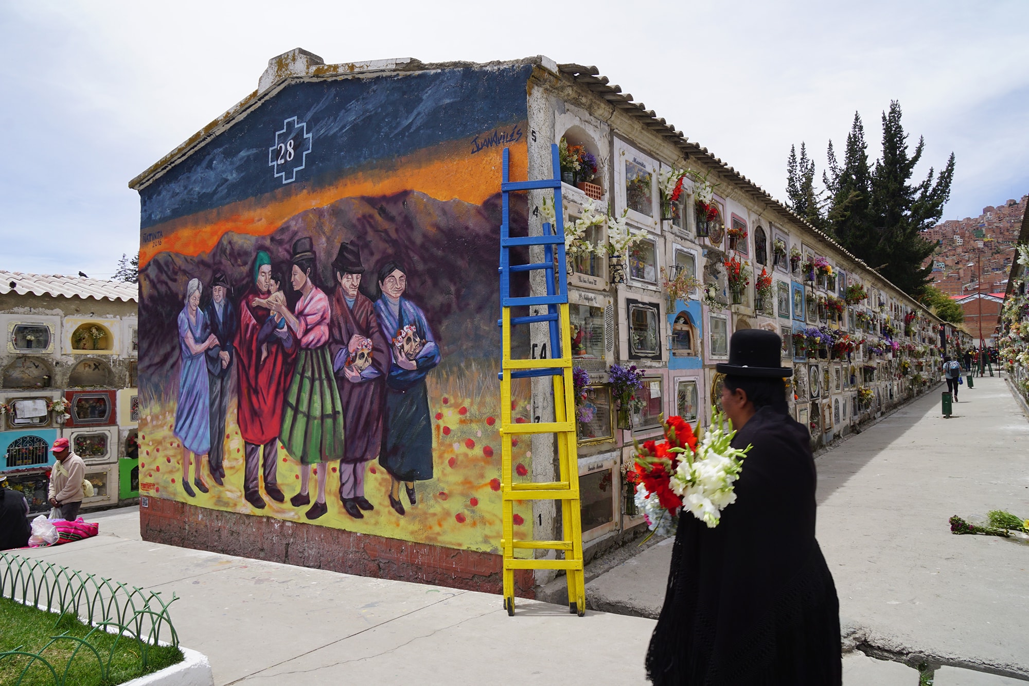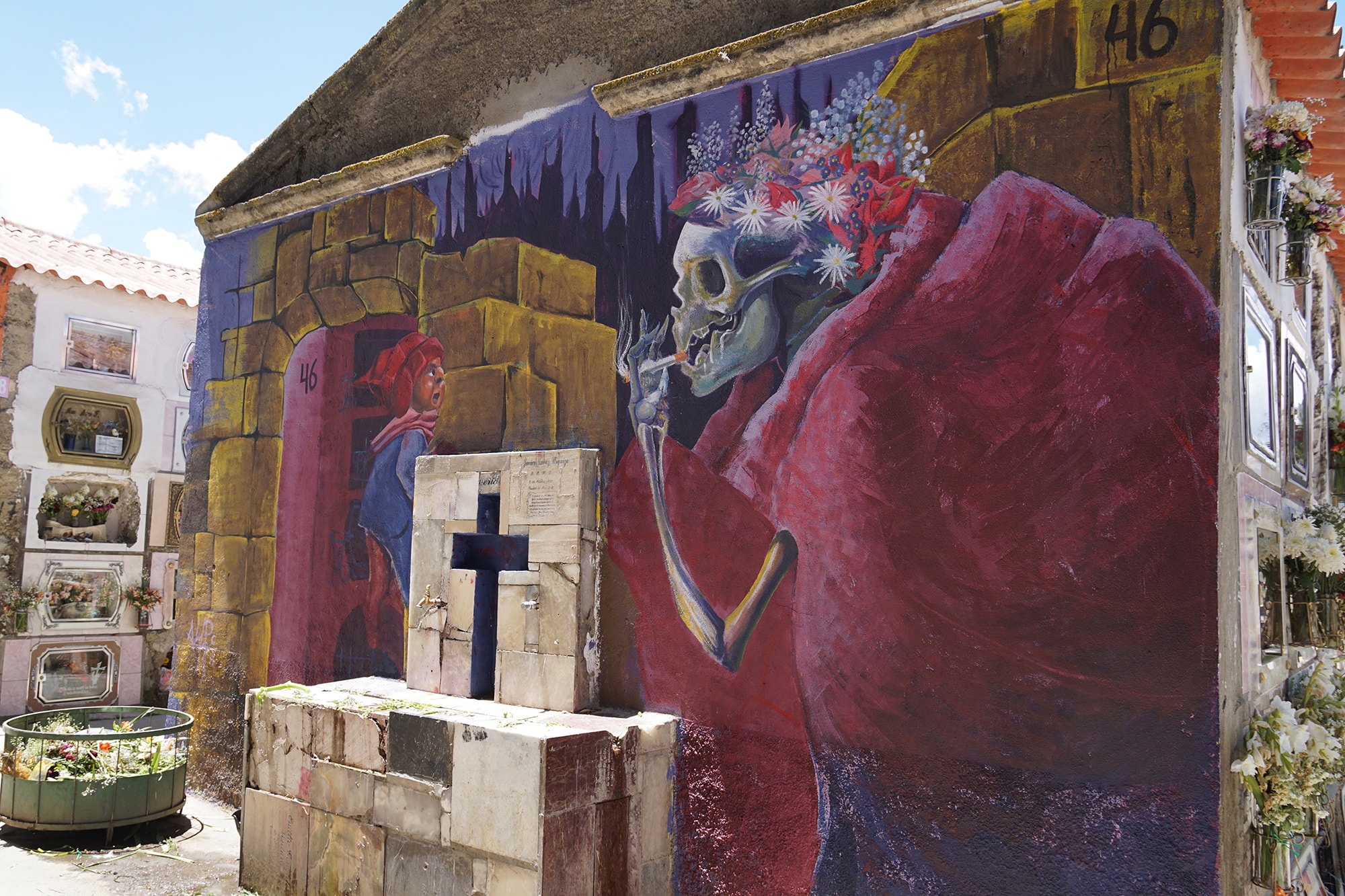 The La Paz general graveyard – Cementerio General de La Paz – has become an open air gallery with many murals by international artists. It is, one might say, art for the dead – and of course for the living. In the general cemetery of La Paz, different festivities are held related to death and the relationships of the local inhabitants with the memory of the deceased. Some notable ones are the All Saints Festival and the Festival of the Ñatitas, both during the month of November, when Ulli visited.