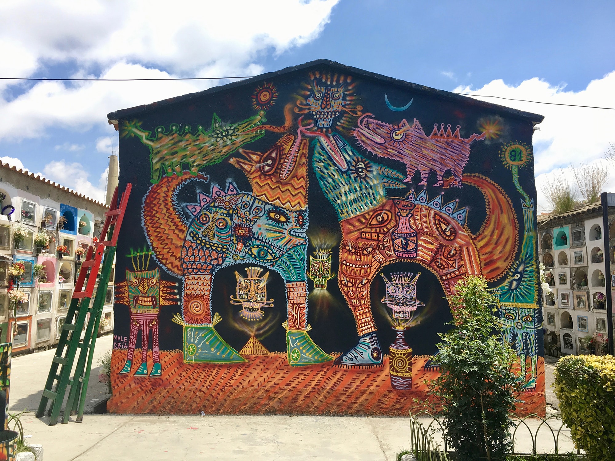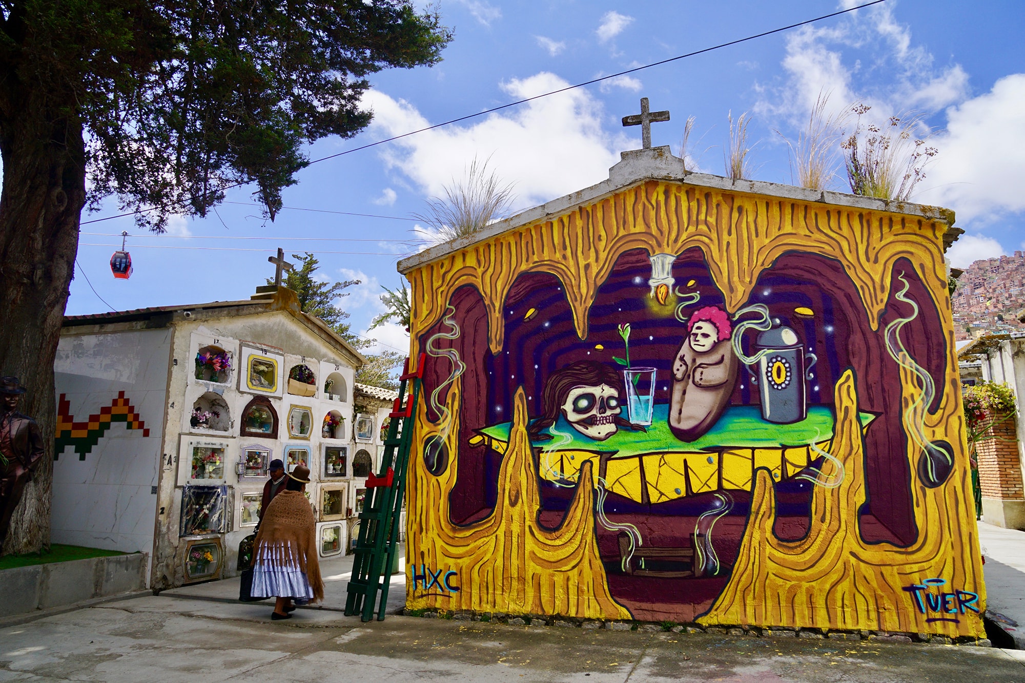 “The location of this “open air gallery” of murals within a cemetery makes it all the more interesting. While the general theme of the murals is strongly linked to the place where they are located, each mural has its unique character, many impressing by sheer size, others by the details that are not visible at first sight. A heady cocktail of beauty and a riot of colours set at an altitude of roughly 3,650 m, above which silently glide the red gondolas of the teleferico through the thin air.”