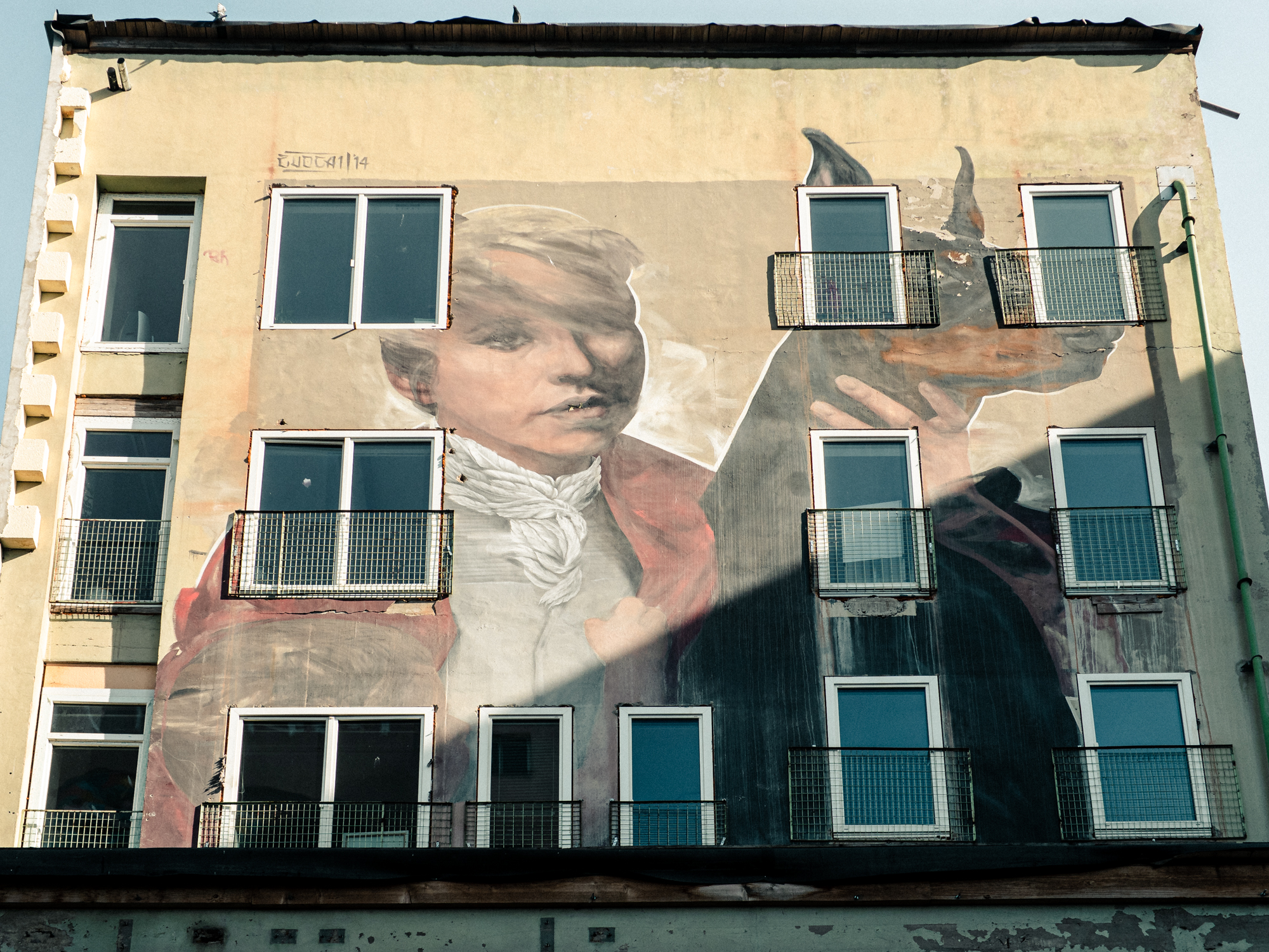 During the Livin’ Streets Festival Graz 2014 twelve international and local artists worked with the help of photo templates, sketches, projectors or grids to paint or spray their artworks onto the previously gray walls. The extremely high building towers must have been a challenge. Eight large walls with dimensions of sometimes several hundred square metres per wall have given Graz a new place in the international street art scene. The idea was to turn boring grey walls in the city into a type of giant outdoor gallery. You can watch a short video of the artist Jaz at work at Taggerwerk in 2014 made by PICKS magazine.