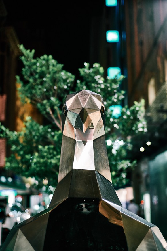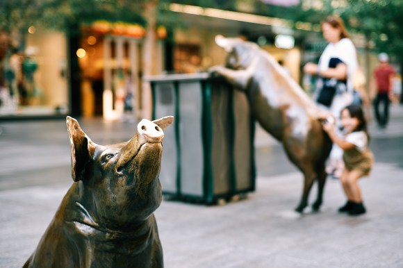Cher Min explored some real Aussie street art and street music in his home town Adelaide, where art in public places forms a rich part of the arts scene. Some of his photos show art by well-established artists (to see what´s what click on the images in the gallery, the file name will appear below each image). One of these are the bronze pigs who won the Adelaide City Council’s Rundle Mall National Sculpture Competition. They were made by the South African-born and Sydney-based sculptor Marguerite Derricourt.