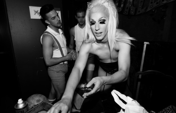 This black and white work grew out of an Adelaide project “Behind the Scenes” – a fly-on-the-wall black and white photography project looking at the contemporary lives of lesbian, gay, bisexual, transgender, intersex or queer (LGBTIQ) people in Adelaide. The project was a witness to people’s lived experiences away from glossy magazine pecs or Mardi Gras costumes and aimed to reflect people and the ways they authentically lived. One part of this project was shooting drag performers backstage at gay night clubs. It has naturally evolved and this selection includes images from “Behind the Scenes” in Adelaide, as well as Sydney and Broken Hill images.