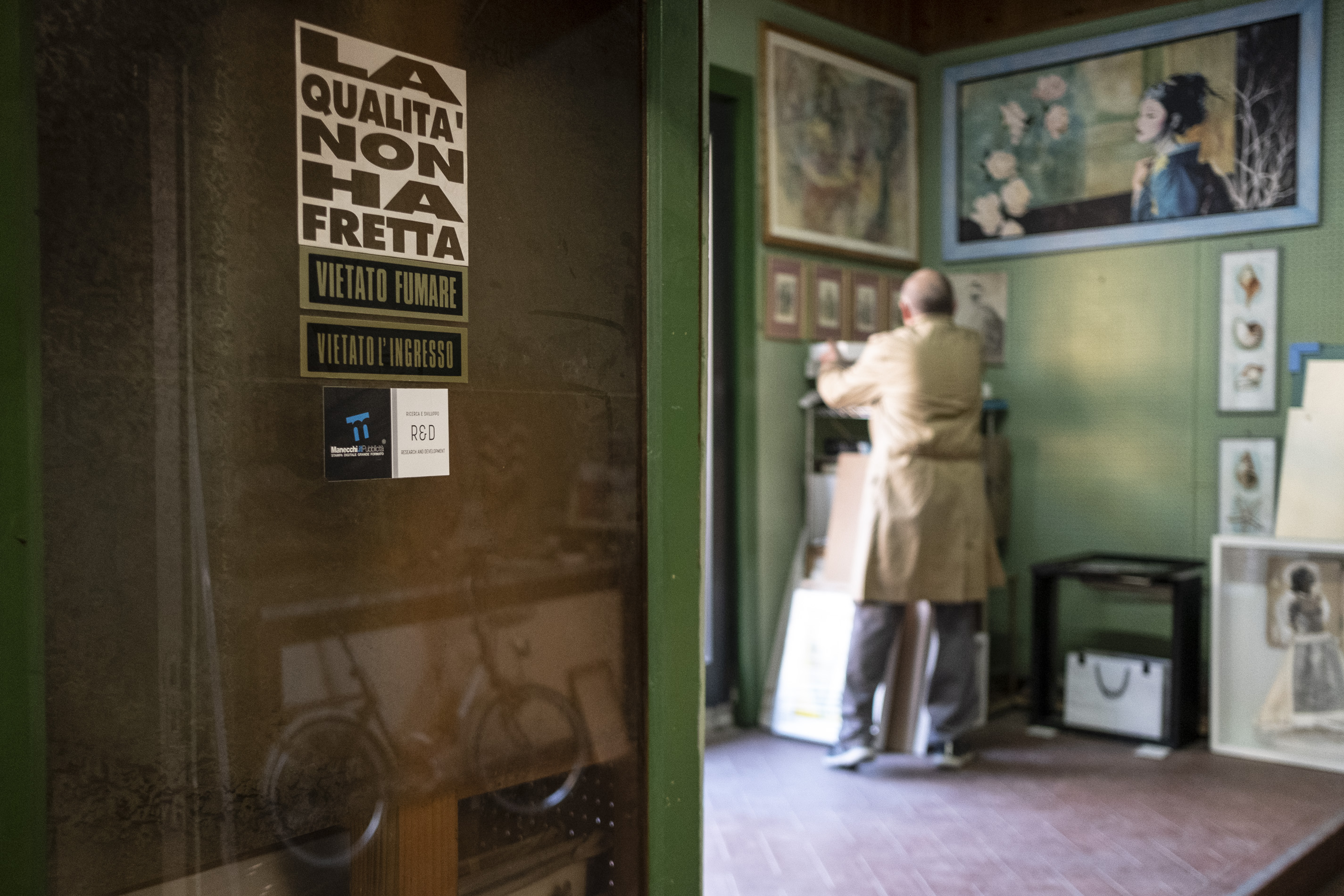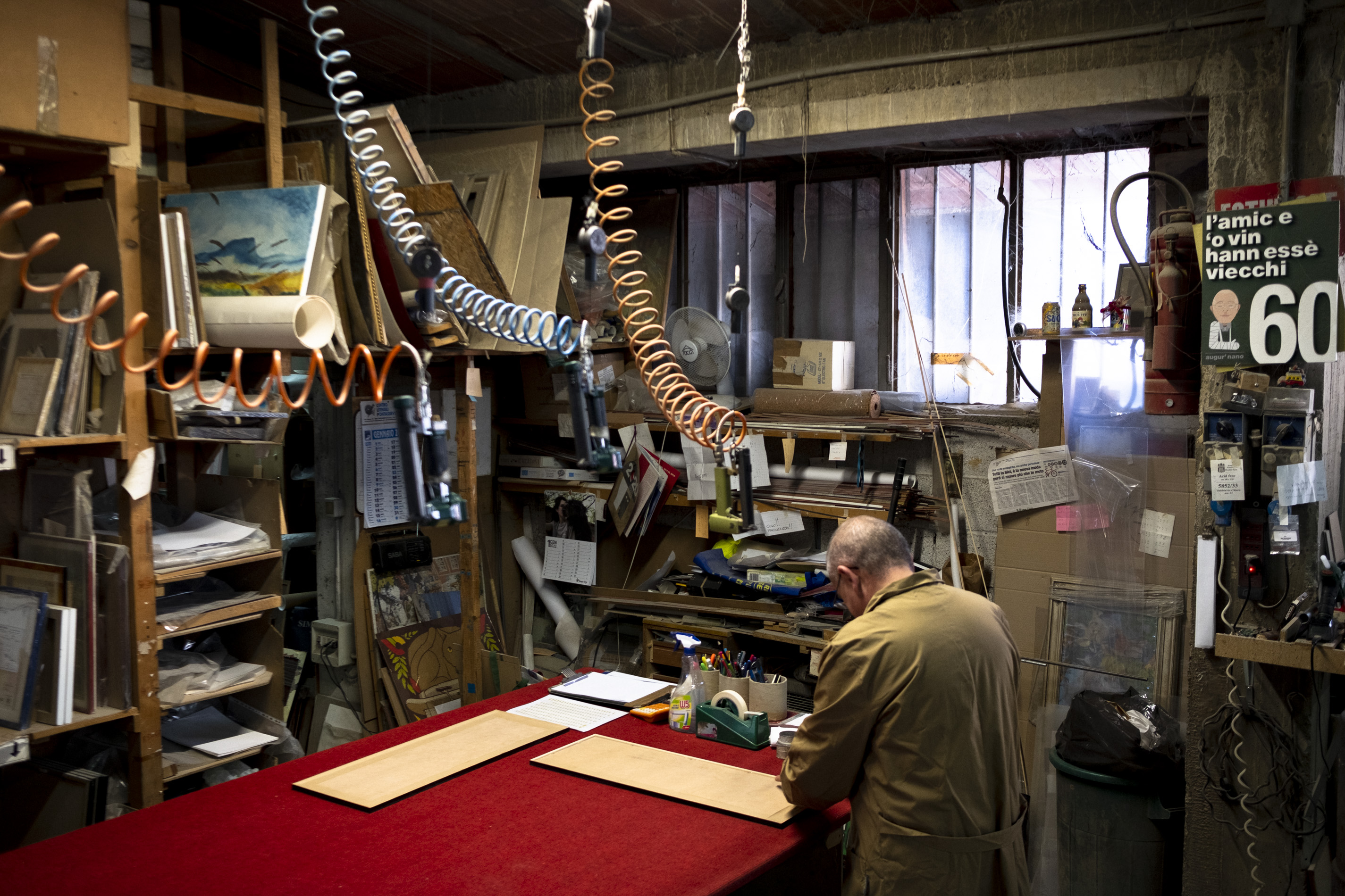 Elisa has documented a framer in his workshop, and she shared his story with us: Roberto has been working as a framer in Elisa´s town, Bibbiena, since 1978, a profession he came to take up by chance. He was looking for a job and so spent a period in the lab of a framer. One day the owner of the lab said, “Hey kid, you must open your own lab, I guarantee you will have the job for life.”