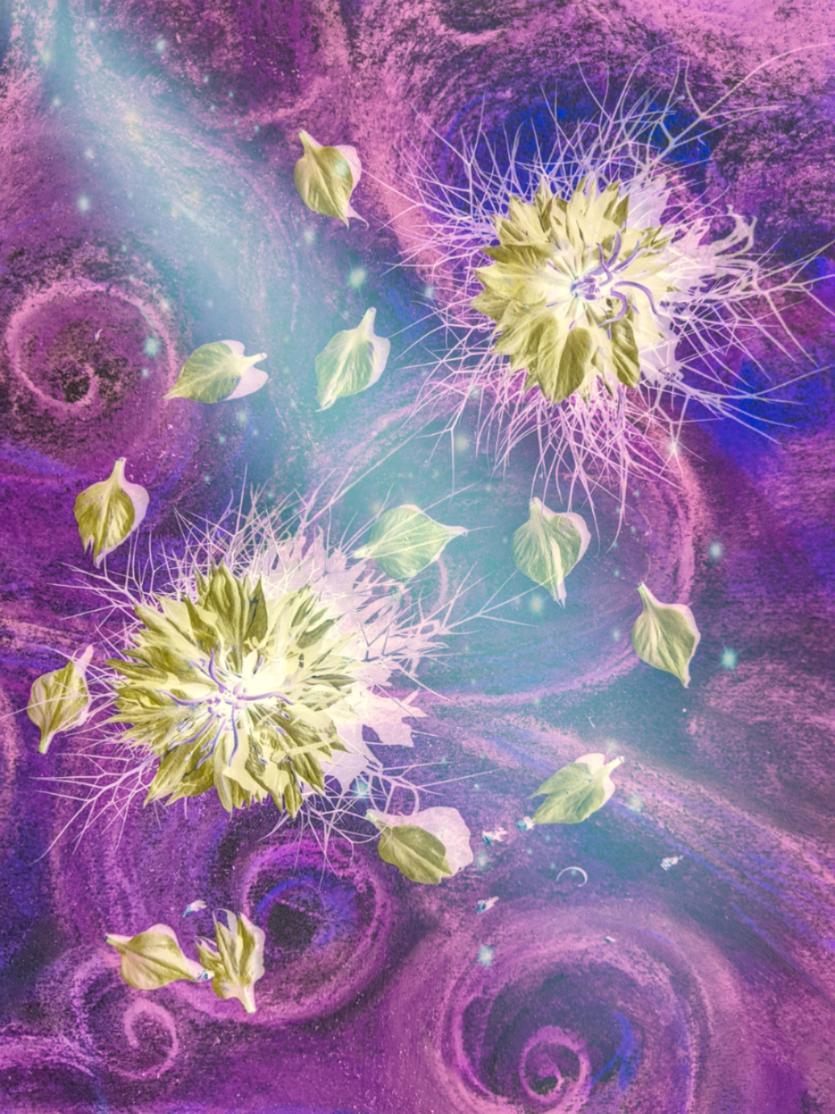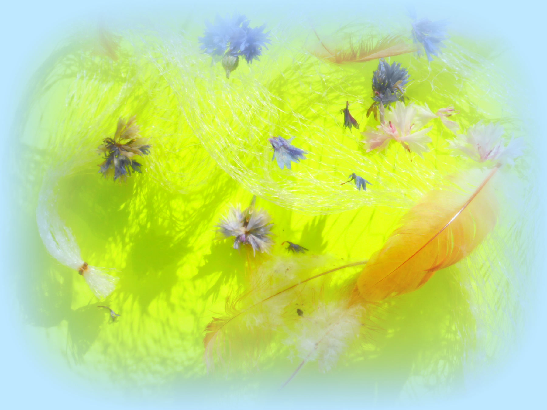The original series, created in 2016 involved photographing flowers and feathers in an orange net. Whilst taking the photo Eva utilized shadows to create a sense of depth. She then digitally manipulated the image to construct lightness and an ethereal mood. In a following series she added pastels to generate texture and depth. More recently she used a post shutter double exposure technique, layering a painting with a photo, to create depth and a sense of flow. In one of the images, she used a photo of herself, showing her body floating between the physical and spiritual world. When Eva created the first images in 2016, she was going through a time when she felt anything but light. “I had become a full-time carer for my daughter, my mum was dying in Germany, and the Brexit vote and the direction the country was heading in cast a shadow over my basic sense of security. I felt mentally out of balance and experienced various physical health problems. Artistic work not only helped me to cope during this ongoing difficult time, but it allowed me to unconsciously express what I needed, a lighter way of being.”