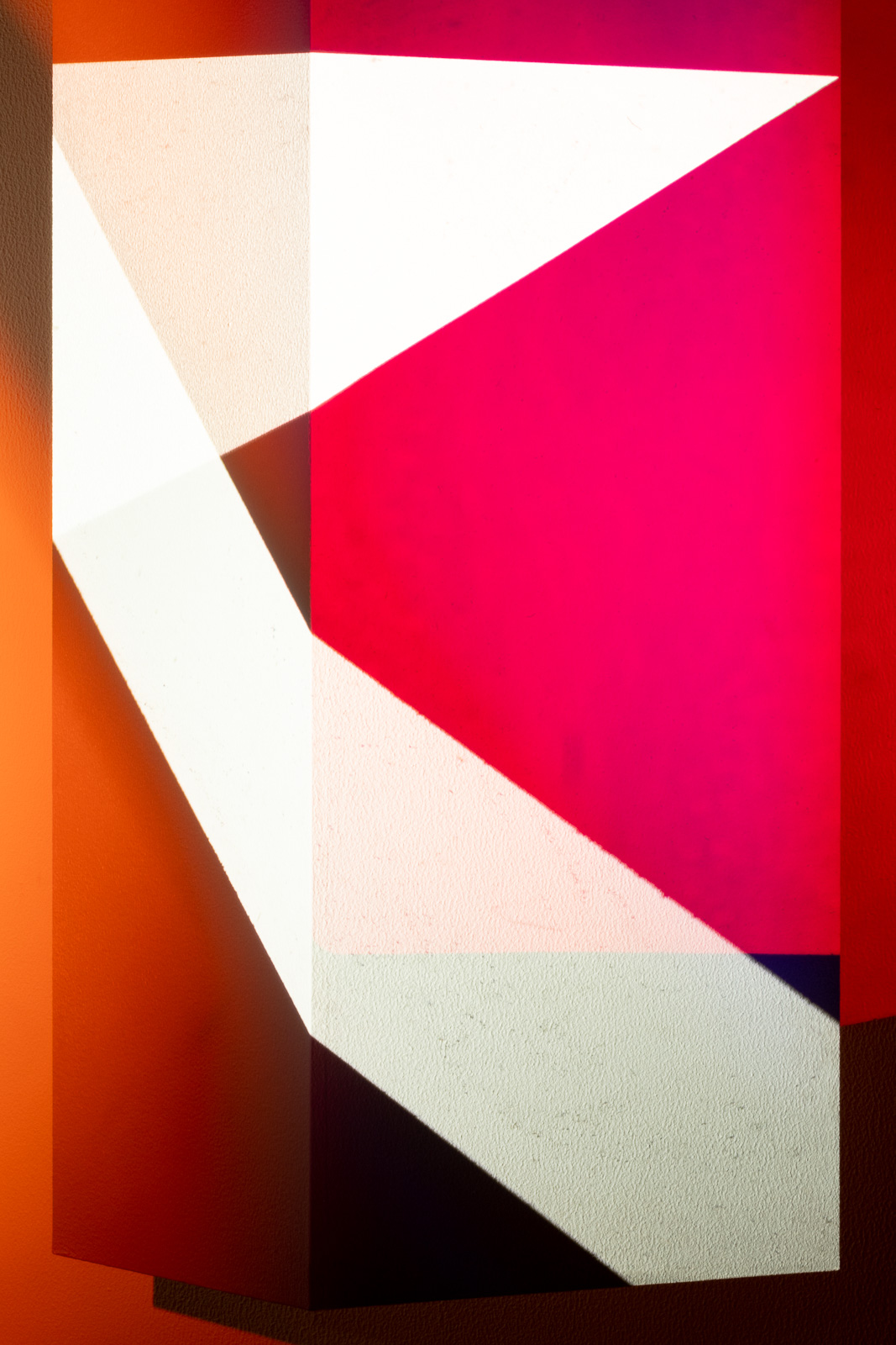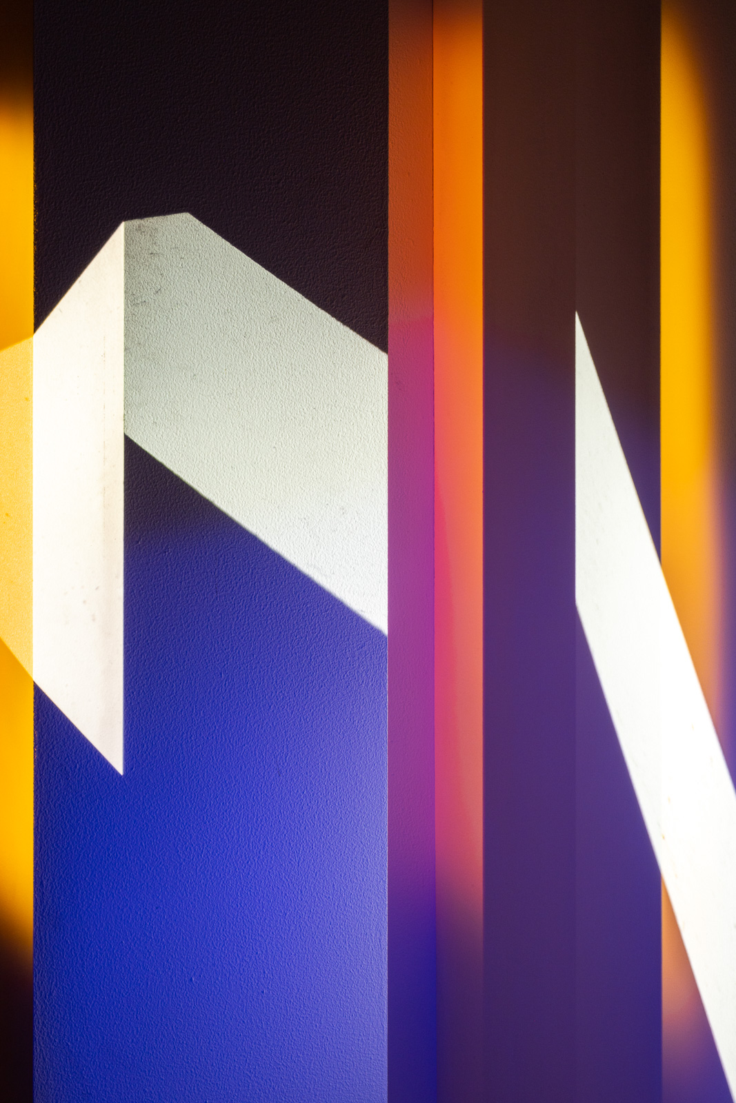 “I started shaping conditions of light, shadow and texture within which I could move around to find compositions that I captured with my camera. For previous projects I collected lots of old slide projectors and I realized I could use these as light sources. A stained glass project I did in 2019 supplied me with some leftover pieces of coloured glass that I applied to change the colour of the light. In pieces of scrap metal I cut simple shapes and placed those inside the projectors to mask the light into geometric shapes. Adjusting the direction of the light sources and moving around with the camera I distorted the perspective, resulting in vibrant graphic imagery in which I am playing with the perception of space.”