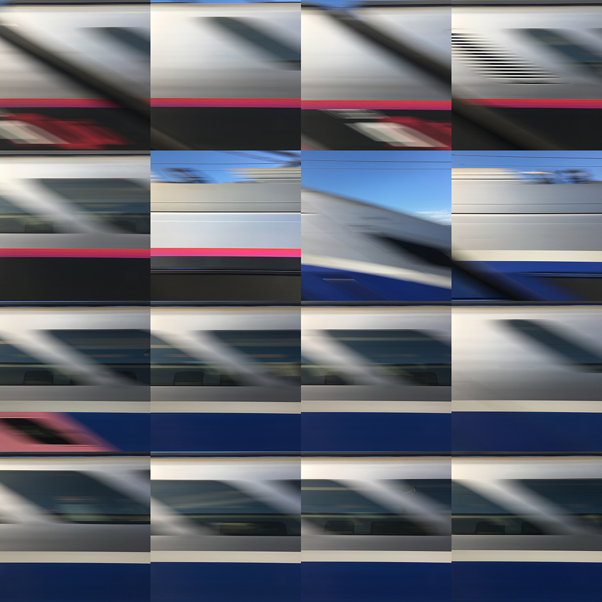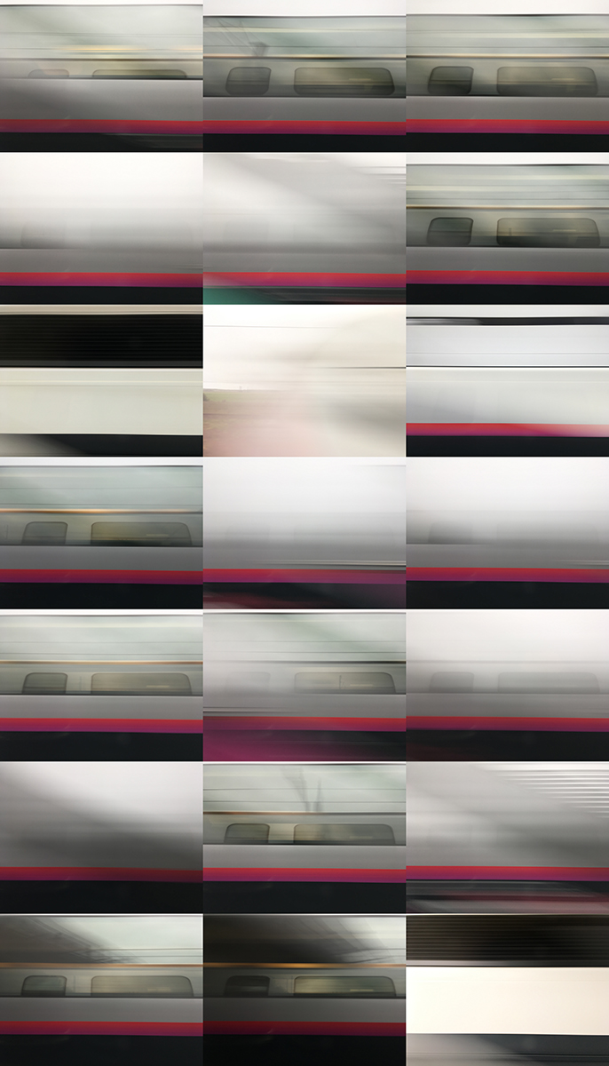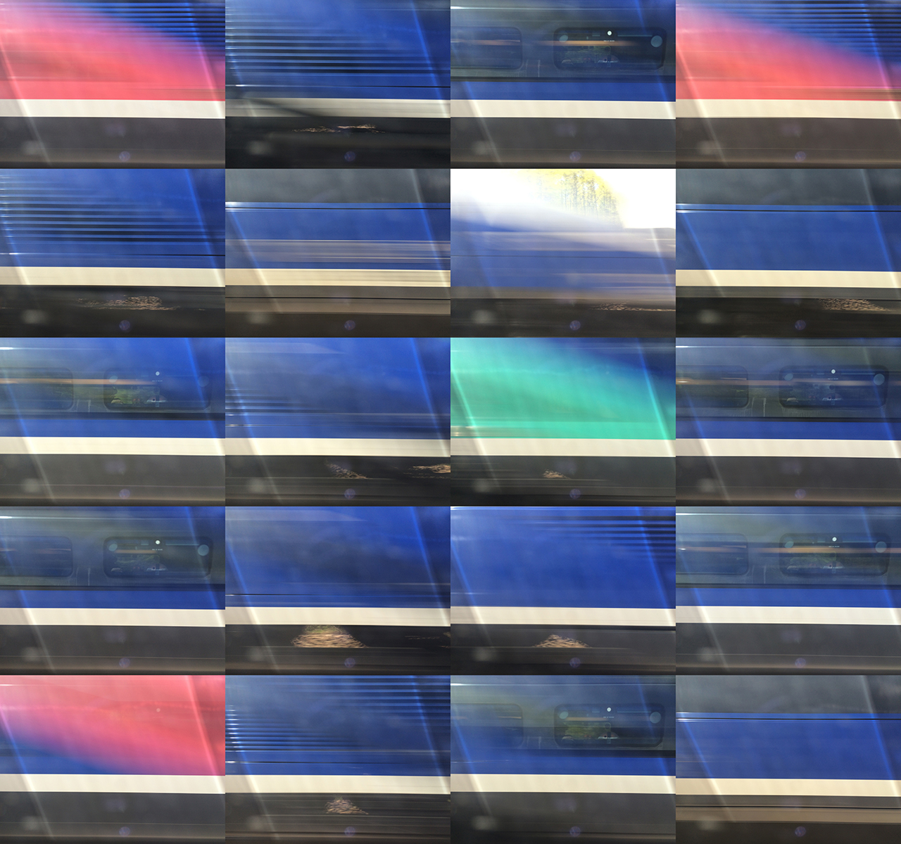 For this series, using an Iphone, Wilfrid took photos through the window while two French high speed trains, the “TGV” (Train à Grande Vitesse), were crossing each other. 600 km/h is the total of the two speeds. The crossing lasted less than two seconds. Let us leave mathematics and physics aside and take the artist´s statement as an artistic expression of the time-space concept.
