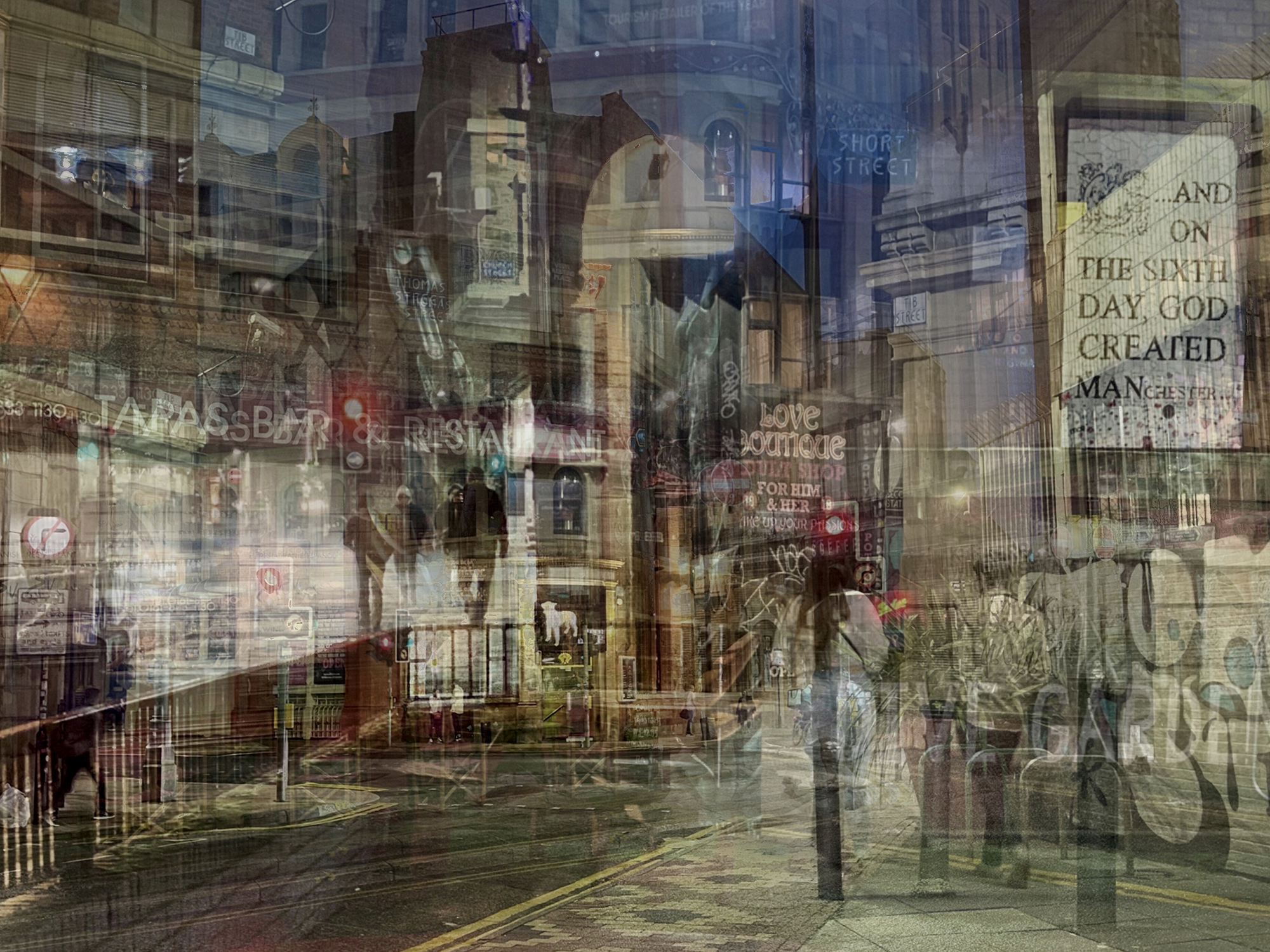 //Adrian was born in Manchester and now lives in North Wales, UK. He has been taking photos most of his life and and has been creating digital art for over thirty years. In his series “Urban Echoes”, he uses multiple exposure techniques to create layered scenes from city streets.