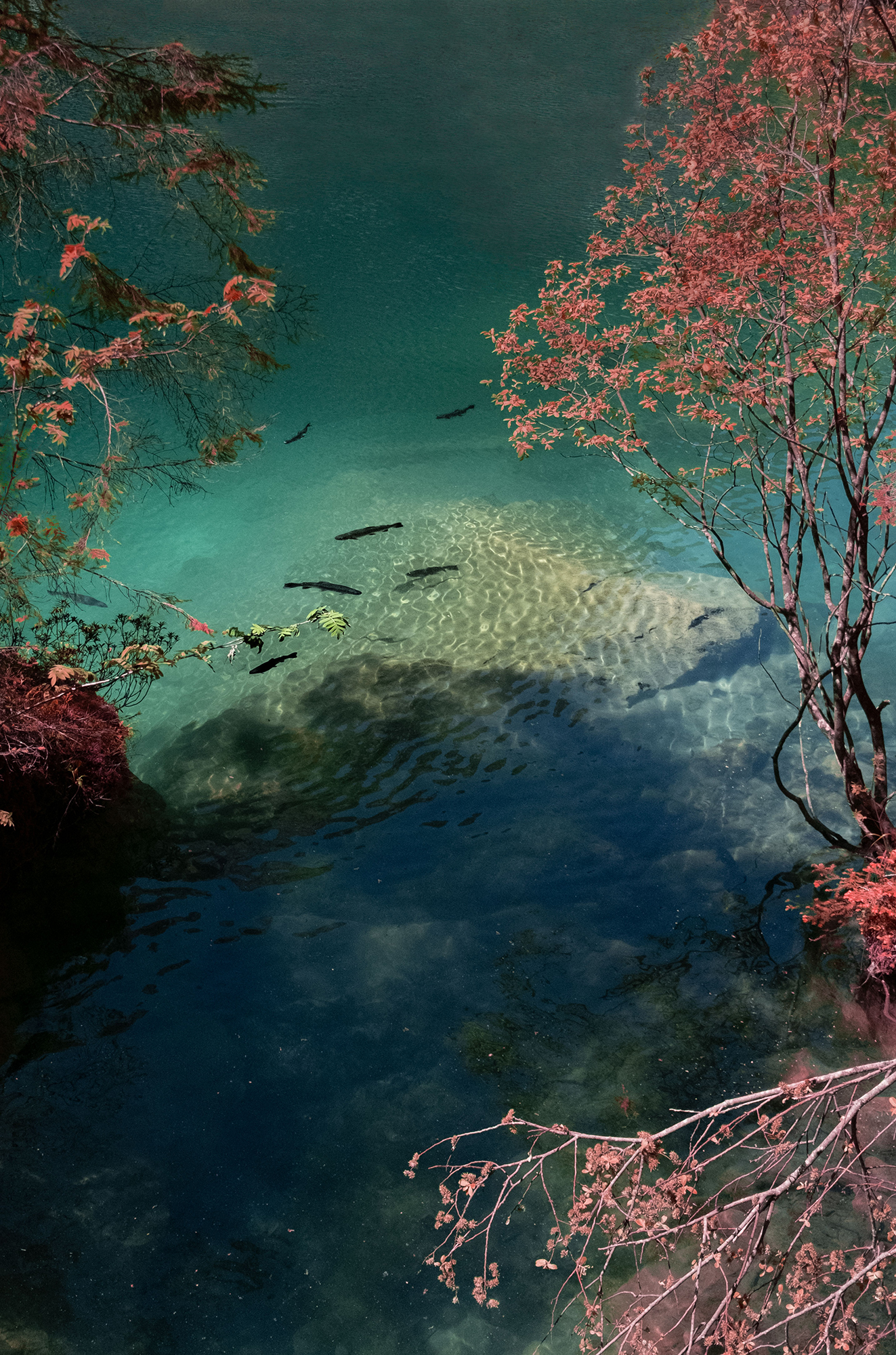 The series “Aquarium Tale” was originally conceived with alternating photos of landscapes and fishes taken in different parts of the world. Some are digital collages that she made using her photos. “There is a science-fiction side in which everyone is free to create their own narrative, guided by the poetry of light in surface and in depth,” Estelle explains. “For me, fishes are wonderful creatures especially because their irridescence reflects the light, their colours can be incredible, and it moves like fire. They are shining like stars, like the two moonfishes who are reflecting light in that deep blue water. There are rays of light coming out of the fishes like in a sci-fi way, as if they were a kind of spaceship. I like to think that in water there’s also the sky and the universe.”