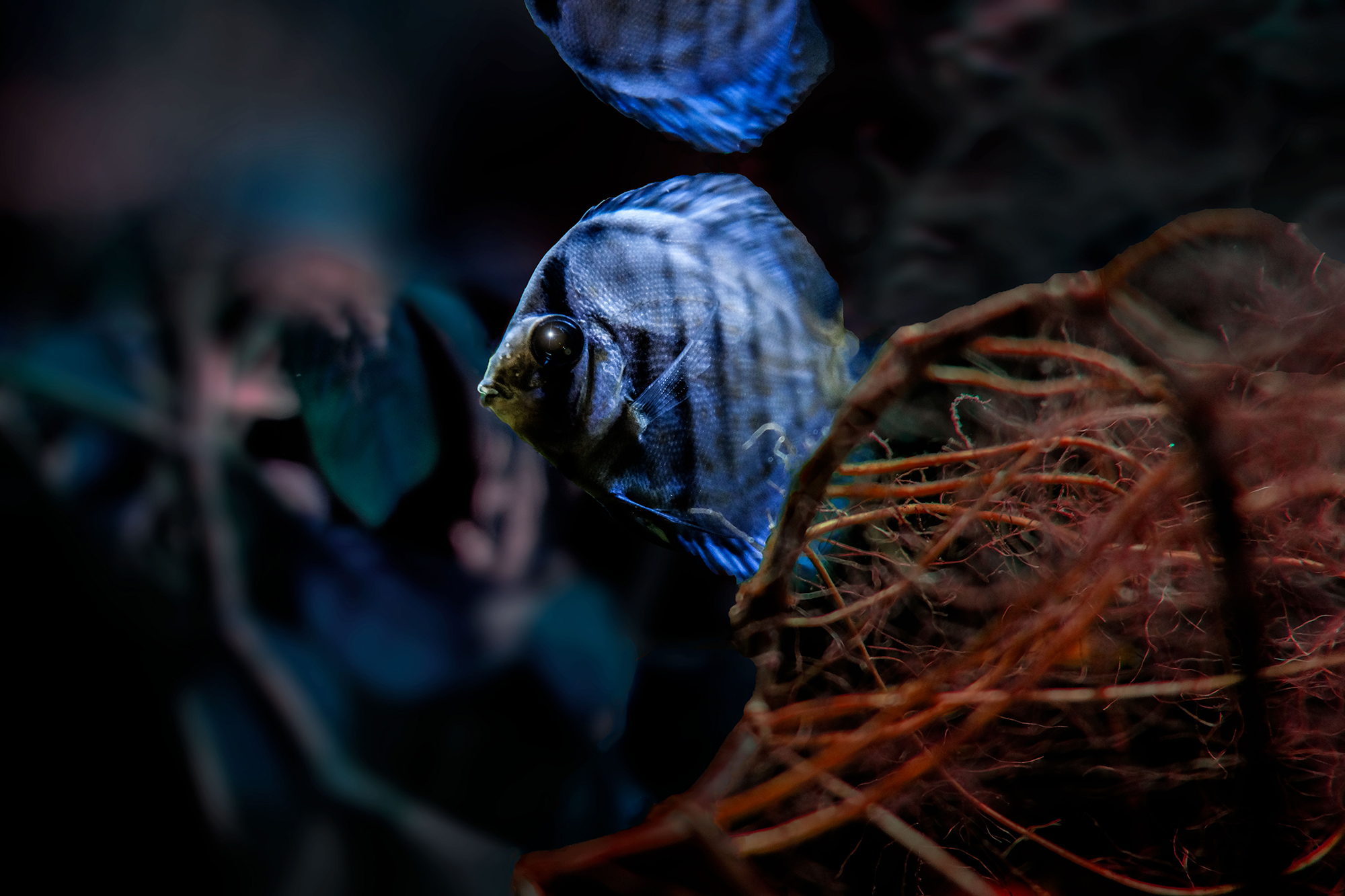 “In the novel “Cottage Landor” of the poet Edgar Allan Poe, he talks about reflections on the lake up to the point that fishes inside look like flying fishes; they appear suspended in the air. Water becomes a universal homeland. Also, Poe forms the double concept of “star-isle” when he contemplates the water: a liquid star is prisoner of the lake much like a star is an island of the sky. I like this idea of encompassing the different elements. In a way, my photo series is an attempt of evasion and of freedom. First, I tried to make the fishes escape out of their aquarium; and second, to free the viewer out of reality through the fishes shapes and details, to enter into their own vision of imagination,” Estelle adds.