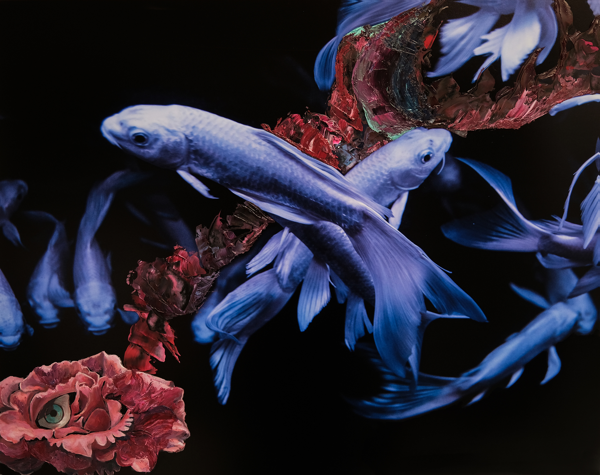 “I like the way colours are getting out of the dark and how dreamlike are the shapes of the fishes, inviting us to imagine our own story. A friend and author of two books, Justine Arnal, wrote a poem about the series “Aquarium Tale” that you can read on my website. I like to collaborate and see how it inspires another field of creation, here the writing.”