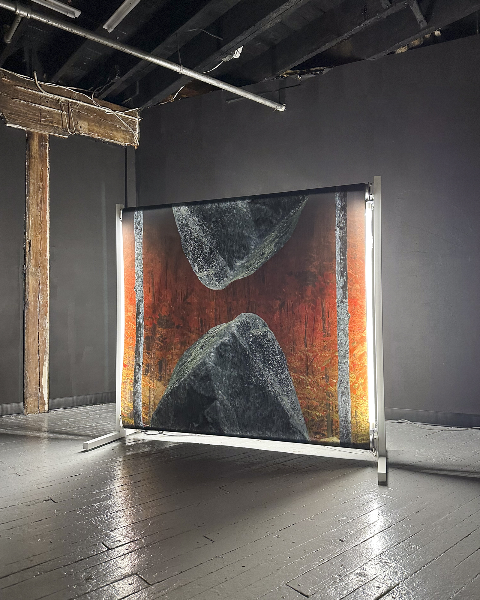 What I find most compelling about my latest scroll series is its capacity to challenge viewers’ perceptions of nature. Through the innovative use of motorized scrolls typically seen in advertising, I craft dynamic landscapes that aim to unsettle and provoke contemplation. Drawing from my background in advertising photography, I intentionally expose the artificiality embedded within commercial imagery, transforming familiar natural scenes through vibrant colors and inverted perspectives. Central to the series are themes of identity, environmental degradation, and the commercial exploitation of nature. By juxtaposing elements of the natural world with mechanical components, I prompt viewers to confront humanity’s impact on the environment. Ultimately, what resonates most with me about this series is its ability to serve as a powerful commentary on the disconnect between humanity and nature in our profit-driven society.