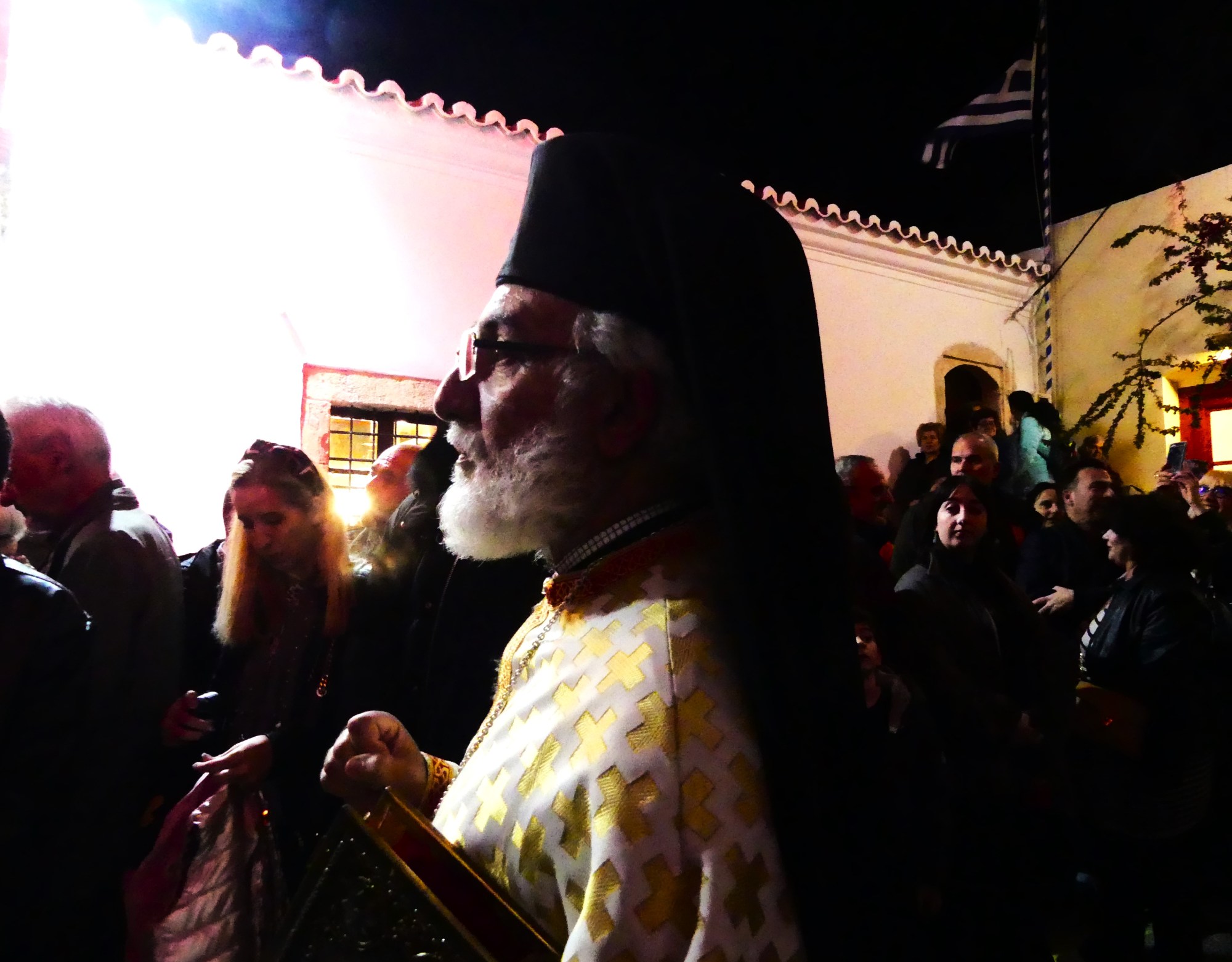 The Epitaph, a symbolic bier of Christ adorned with a vibrant tapestry of flowers, emerges from the Church of Estavromenos. Locals, pilgrims, and visitors gather for the slow, meditative walk that winds through the heart of Chora, a testament to the enduring cultural heritage being honoured by the island’s community. As the procession approaches the imposing Venetian castle, a stunning spectacle awaits. Locals have carefully placed rows of tin candlesticks on the rocks, creating a path of flickering light that leads up to the lighthouse and crowns the castle itself.