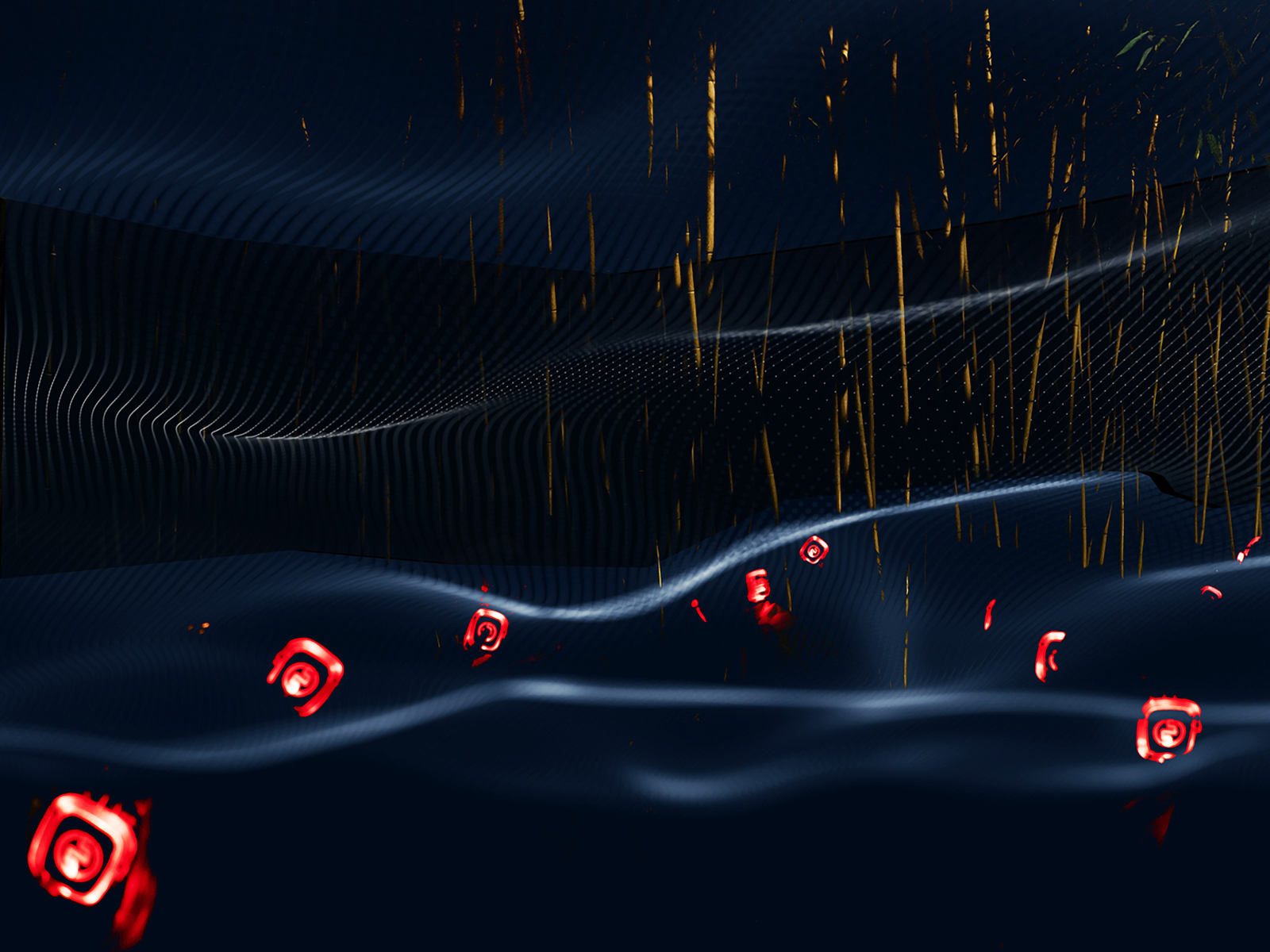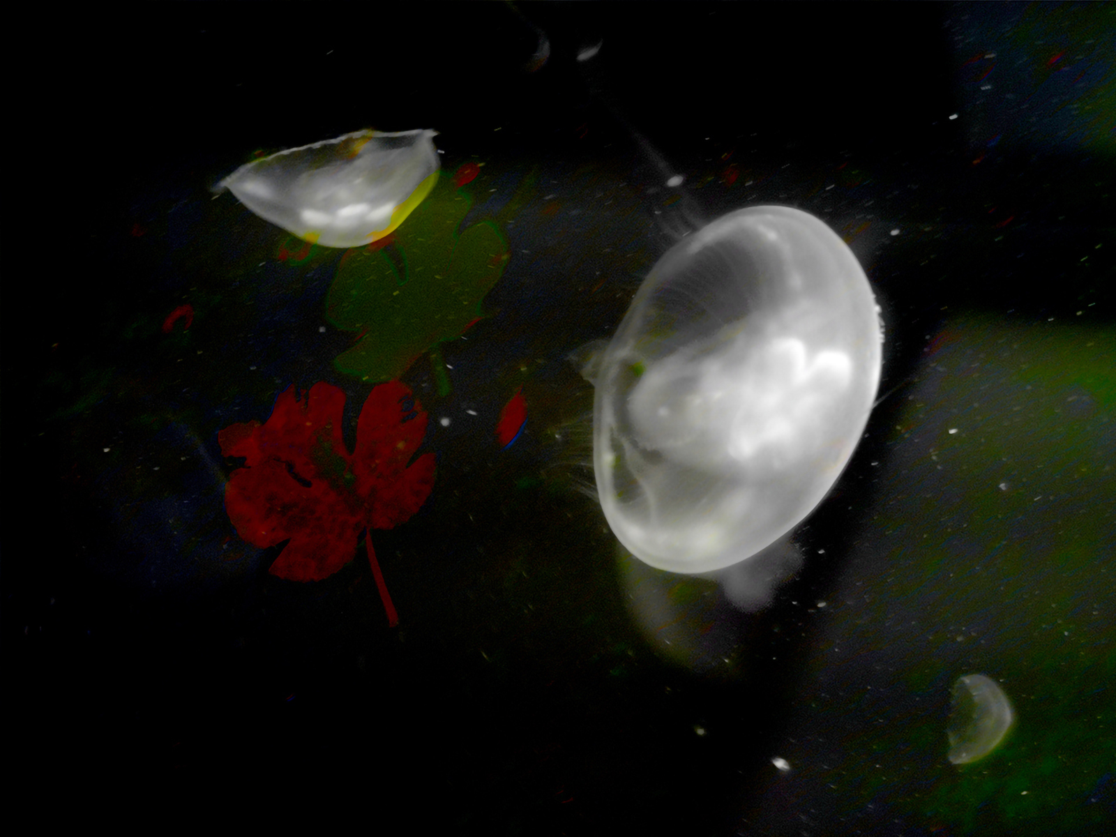 In Onde, digital pulses of crimson and electric blue ripple through the image like sound waves, evoking an oceanic cosmos. And in Terracqueo, ghostlike jellyfish drift over floral shadows—dreams within dreams.