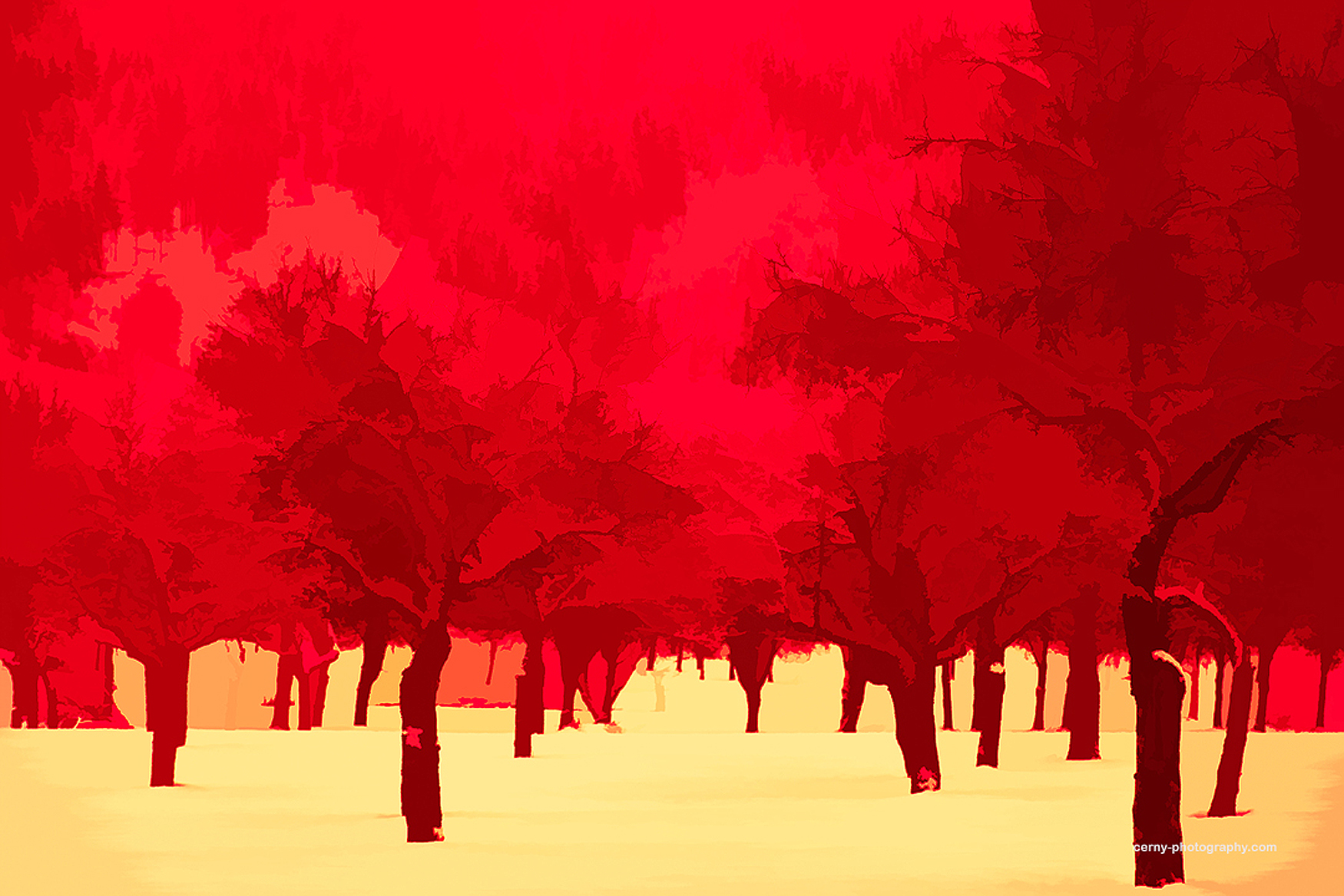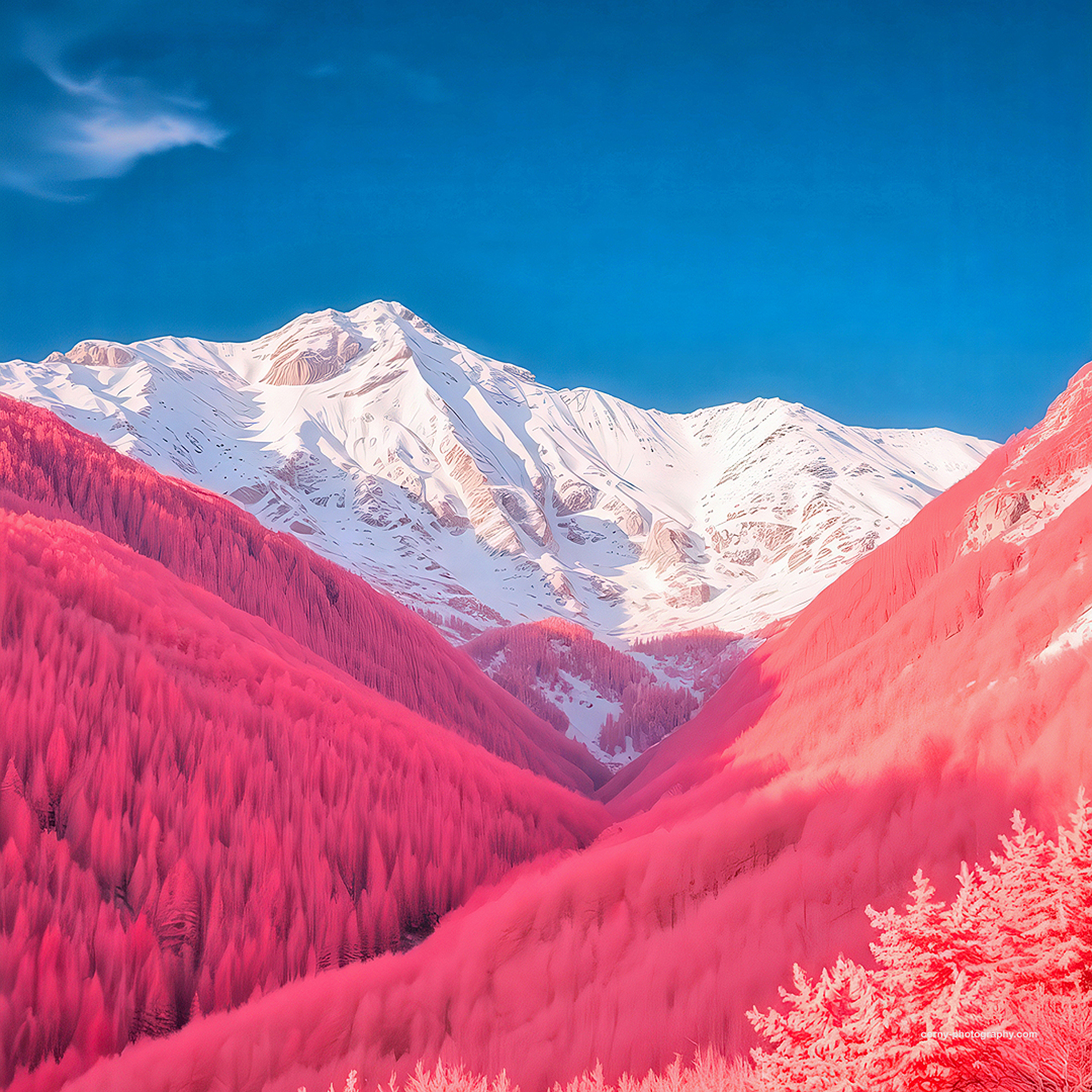In another, a majestic alpine panorama is rendered uncanny by infrared treatment: where we would expect muted winter tones, we are met instead with electric rose-hued forests that cascade down towards icy valleys, flanked by crystalline peaks under a bold cobalt sky. A quiet orchard is engulfed in a searing spectrum of scarlet and crimson, the tree trunks slicing upward like silhouettes against a molten backdrop. The snow beneath glows a muted gold, so the scene feels less like a winter grove than an infrared reverie where warmth radiates from a place that should be cold.