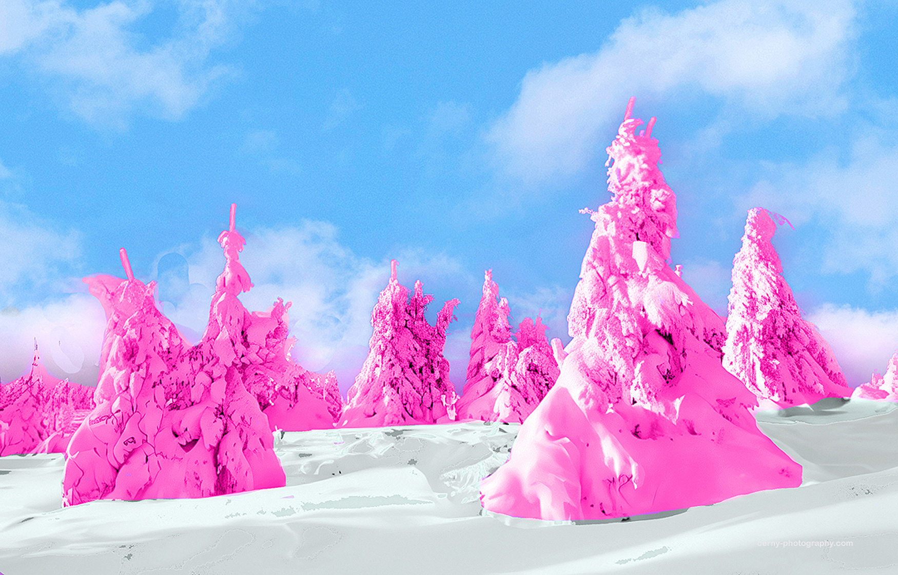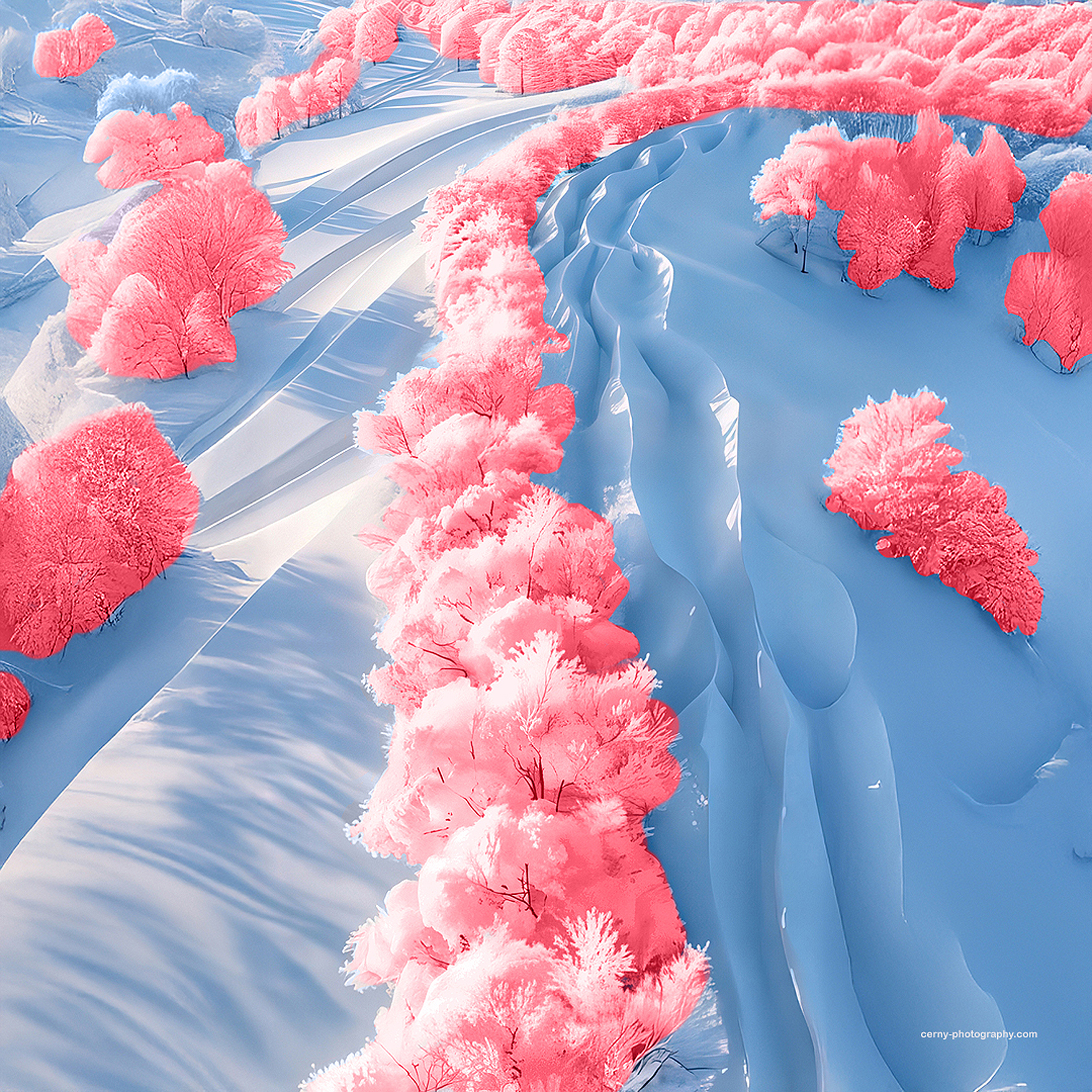 The images from Jochen’s Snowland series transport us into an altered reality where winter becomes a surreal spectacle. In one photograph, snow-covered hills ripple like frozen waves, interrupted by a vivid artery of candy-floss pink trees that carve an organic line through the structured landscape.