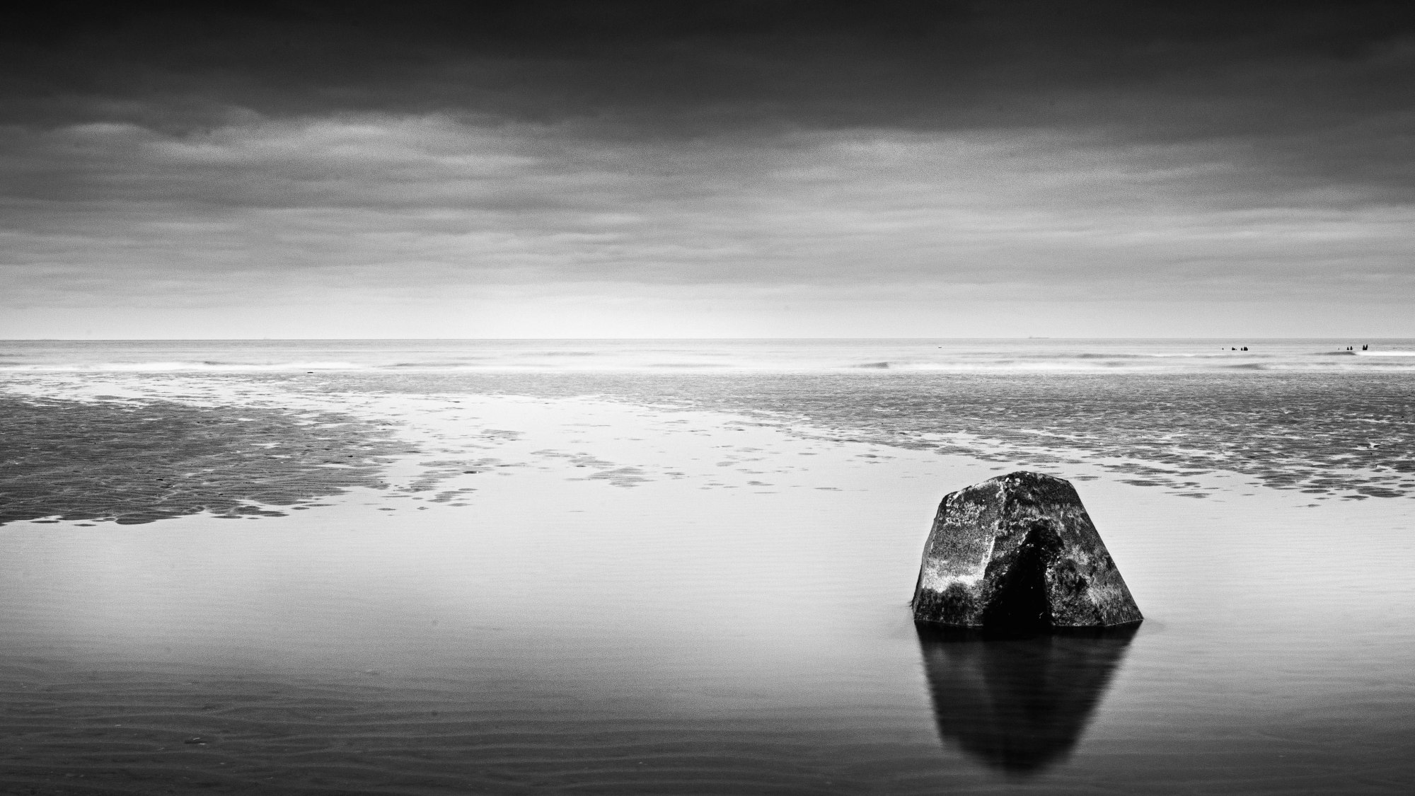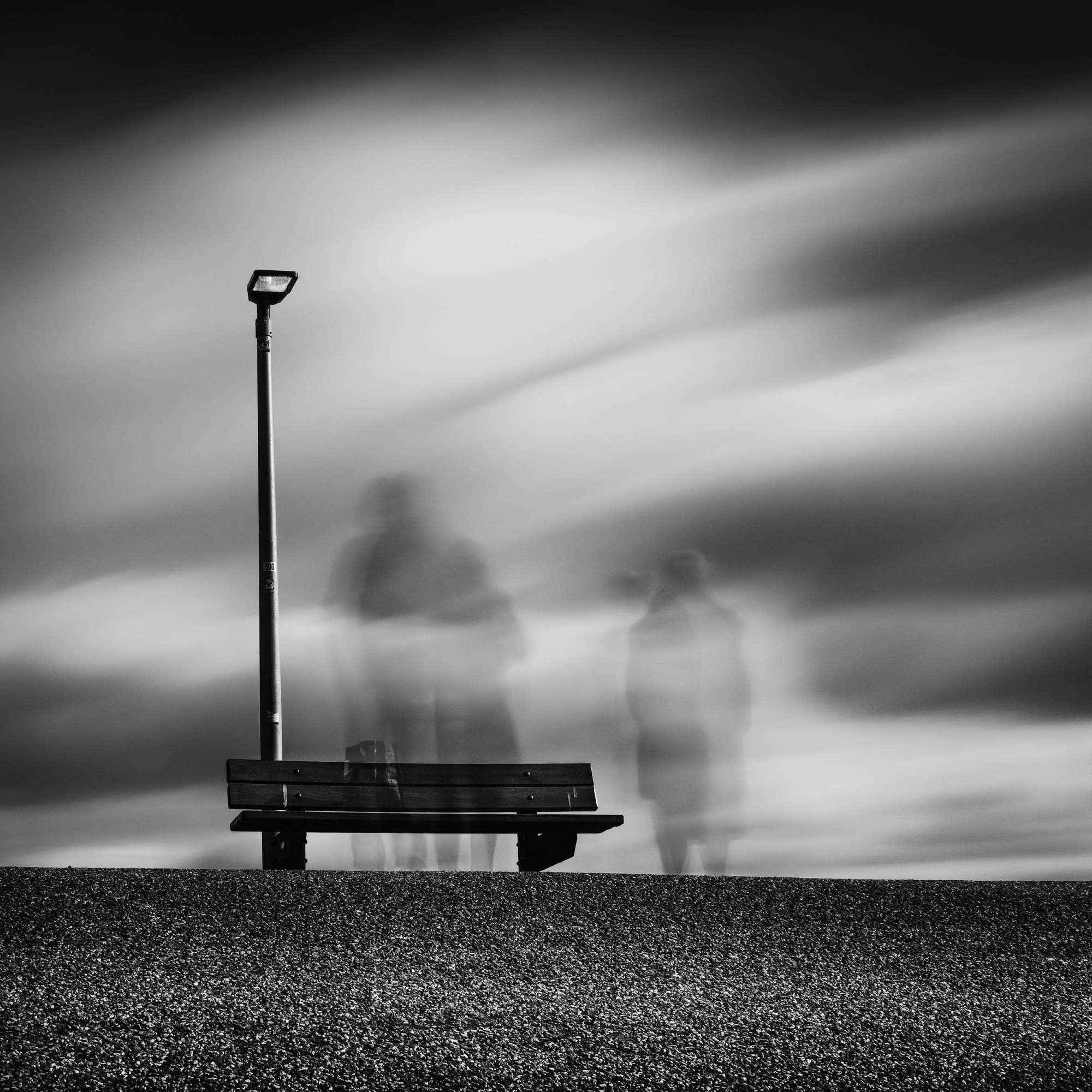 Each image in this series—visible in the selection shown here—has a haunting calm. In Where The Noise Ends_10, a group of figures emerges faintly from a glowing haze, their reflections soft and spectral, as though rising from memory. In Where The Noise Ends_07, a dock stretches into the water like an unfinished sentence, suspended in a long exposure mist. Other images (08, 11, 14) turn the tides and sands into calligraphies of motion and time, etched with minimal brushstrokes of grey.