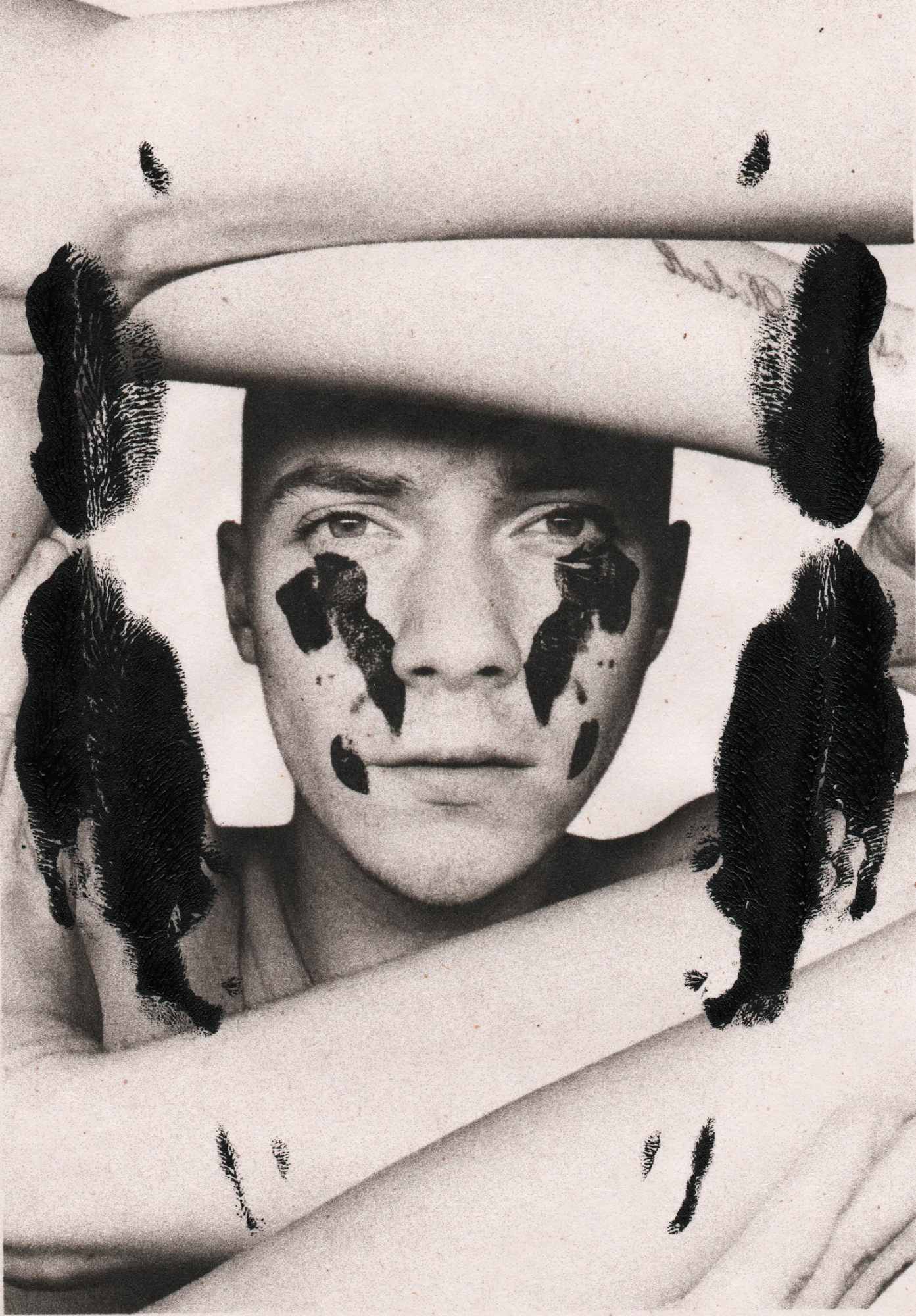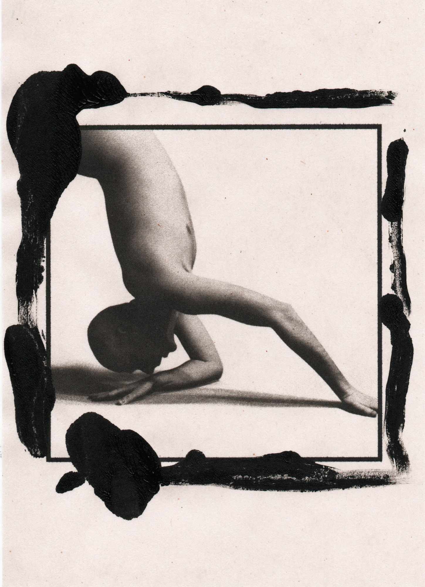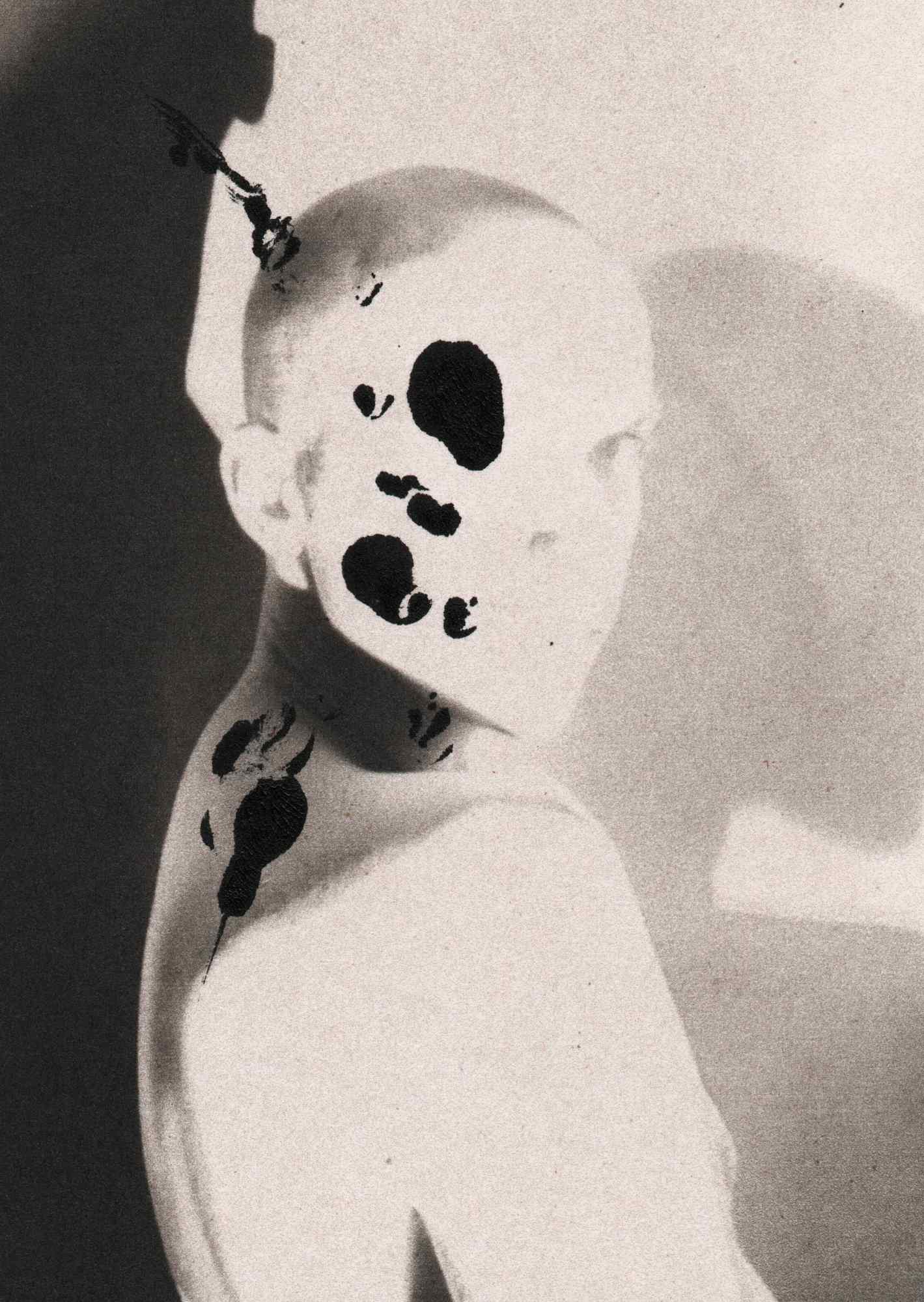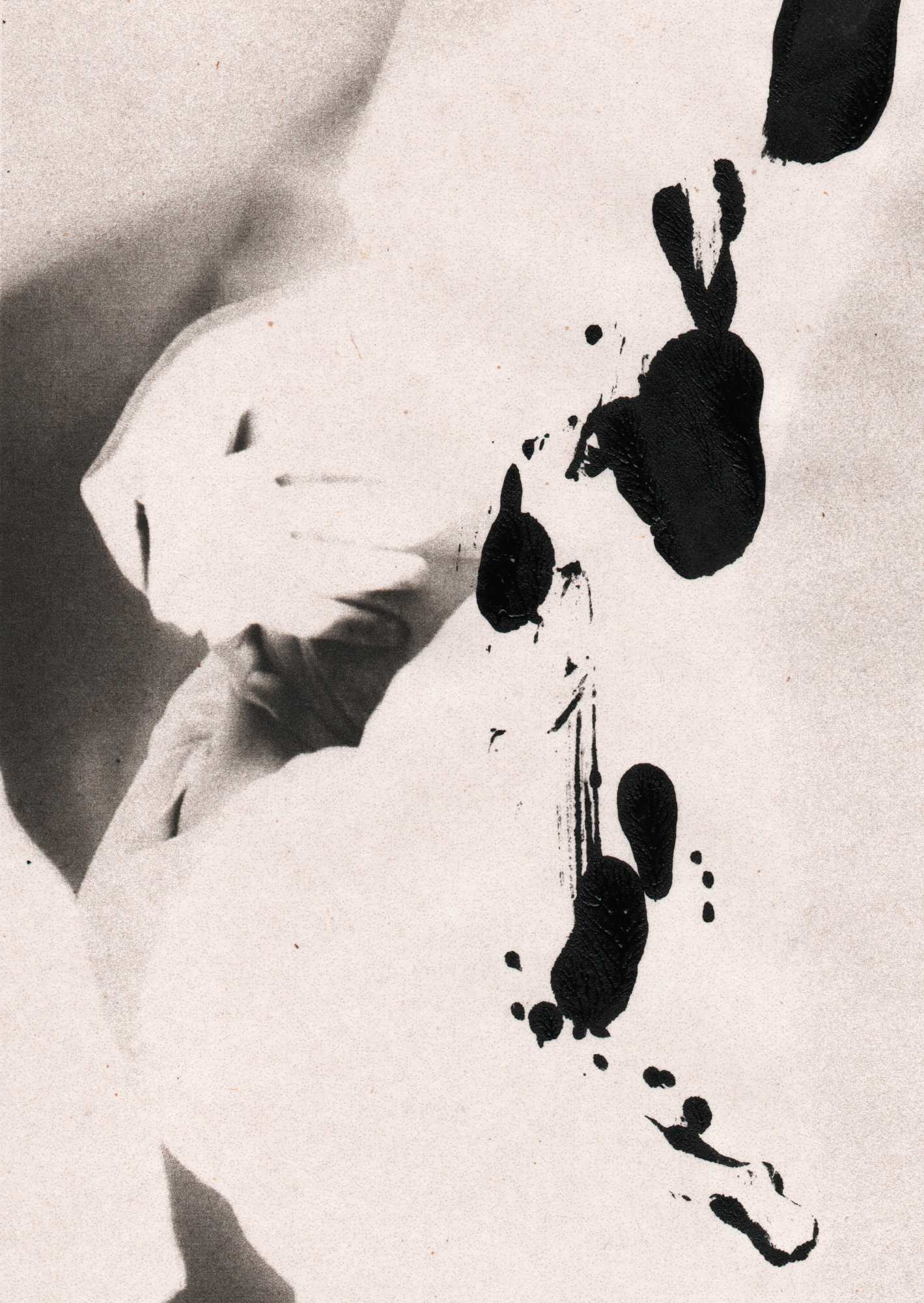 Technically, Plateau merges analog photography with expressive ink-based mark-making. Bohdan prints scans of his analogue photographs on vintage newspaper paper—a medium already freighted with memory, fragility, and the echo of public noise. Onto these prints, he applies what he calls “psychological-dynamical paintings”—gestural strokes that look like bruises, spills, or nervous systems gone rogue. These interventions underscore corporeality not as form, but as feeling.
