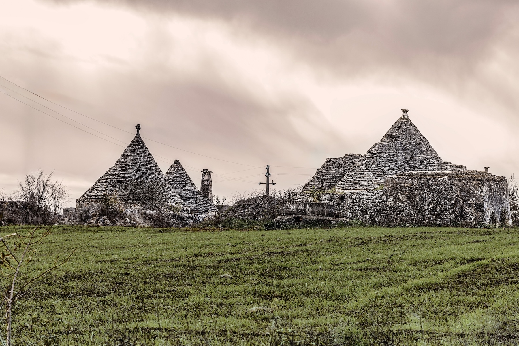 The series focuses on two primary architectural forms: trulli and masserie. The trulli — dry-stone constructions dating back to the Middle Ages — are built using local limestone and often stand on much older human settlements. Their conical shapes recall prehistoric tombs, creating a visual and symbolic continuity between burial, dwelling, and memory. These structures were never designed for permanence in a monumental sense; instead, they reflect adaptation, repetition, and survival.