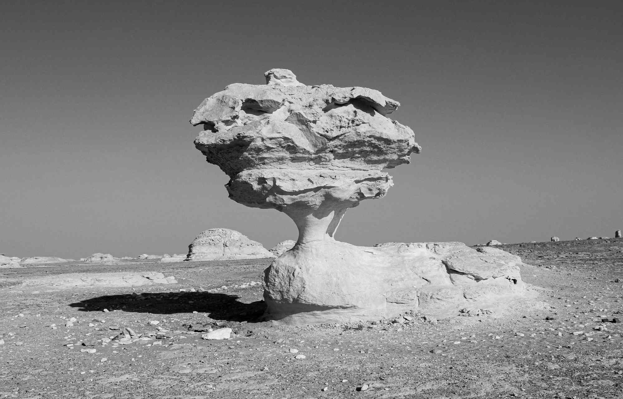 Over millions of years, wind and sand have sculpted this mineral plateau into an otherworldly terrain. Mushroom-shaped rocks, eroded columns, fossil traces, and improbable curves rise from the desert floor like a vast open-air sculpture park. The ground is dry and brittle underfoot; the horizon shimmers in the heat. Time here is not measured in hours or days, but in erosion, accumulation, and geological memory.