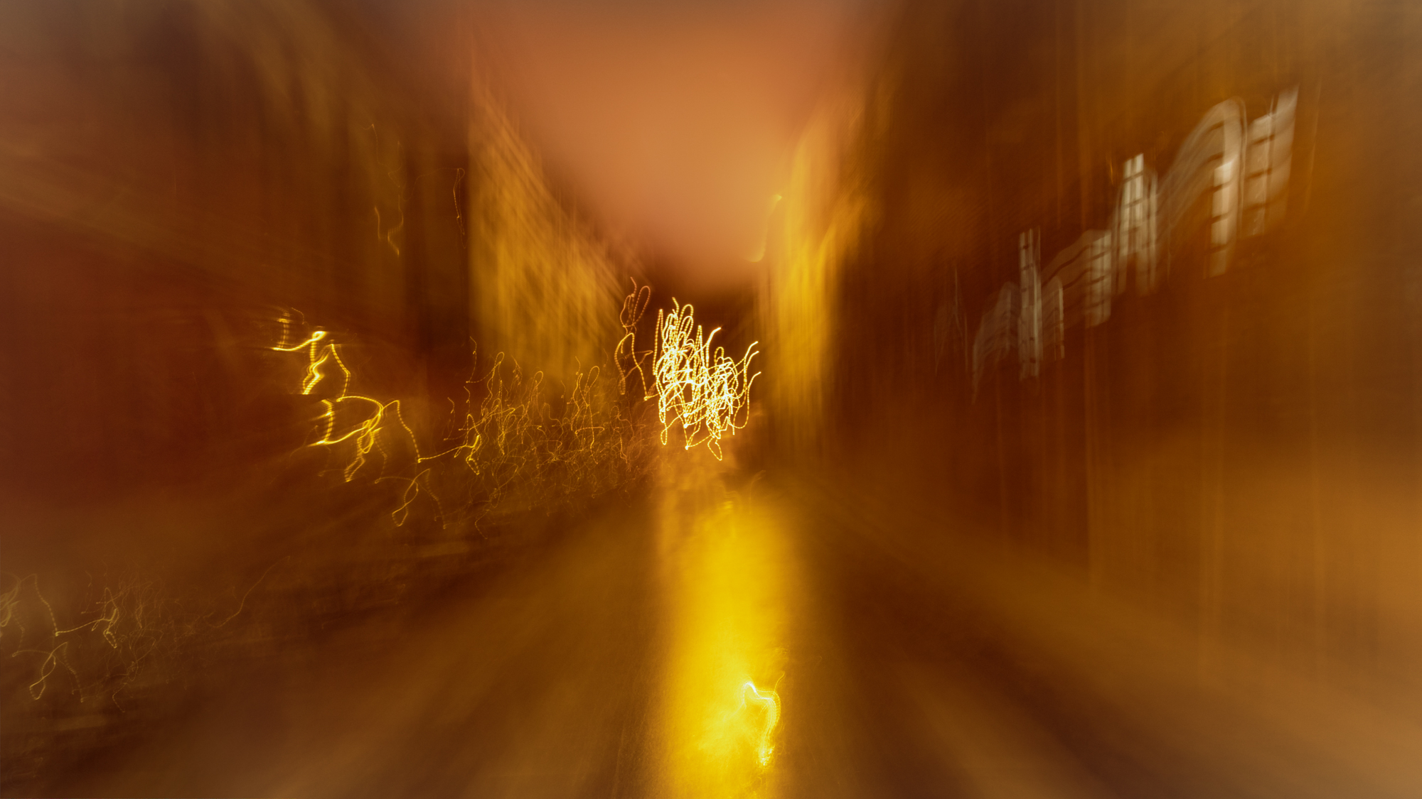 Urban Solitude examines contemporary isolation within highly engineered urban environments—but not through stillness or monumentality. Instead, everything here is in motion. Streets smear, buildings tremble, light fractures. The city does not present itself as solid or stable, but as a continuous process: a system in constant flux.