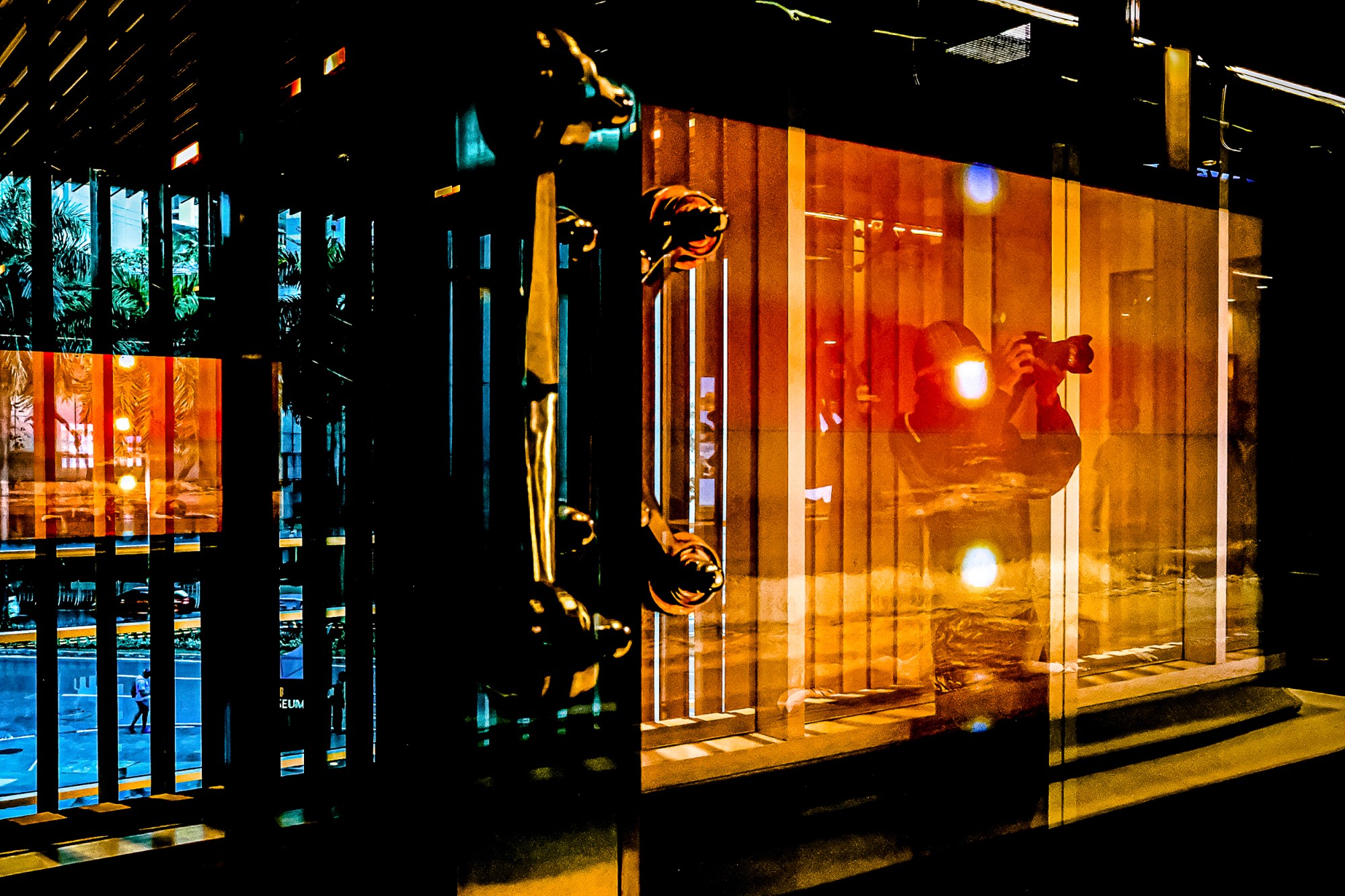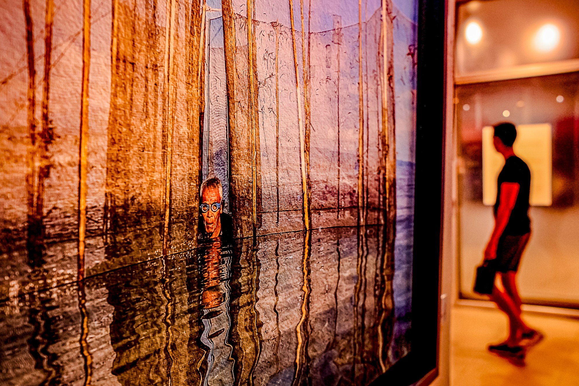 The resulting images operate in a kind of visual echo chamber. Reflections, glass surfaces, saturated colors, and overlapping planes create compositions where it is not always clear what is being looked at and who is doing the looking. A man stands in front of a painting, but the painting seems to watch back. A photographer appears inside his own frame, dissolved into light and reflection. A figure emerging from water becomes both subject and illusion, hovering somewhere between documentation and myth.