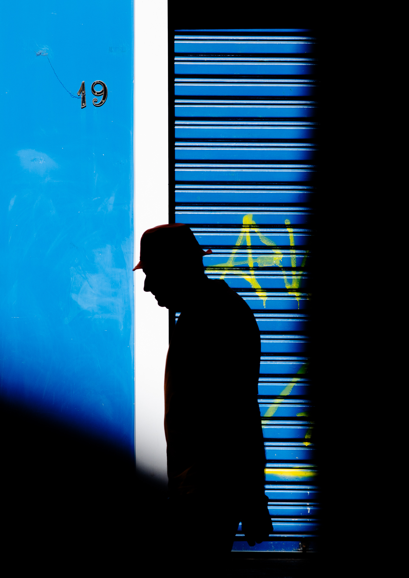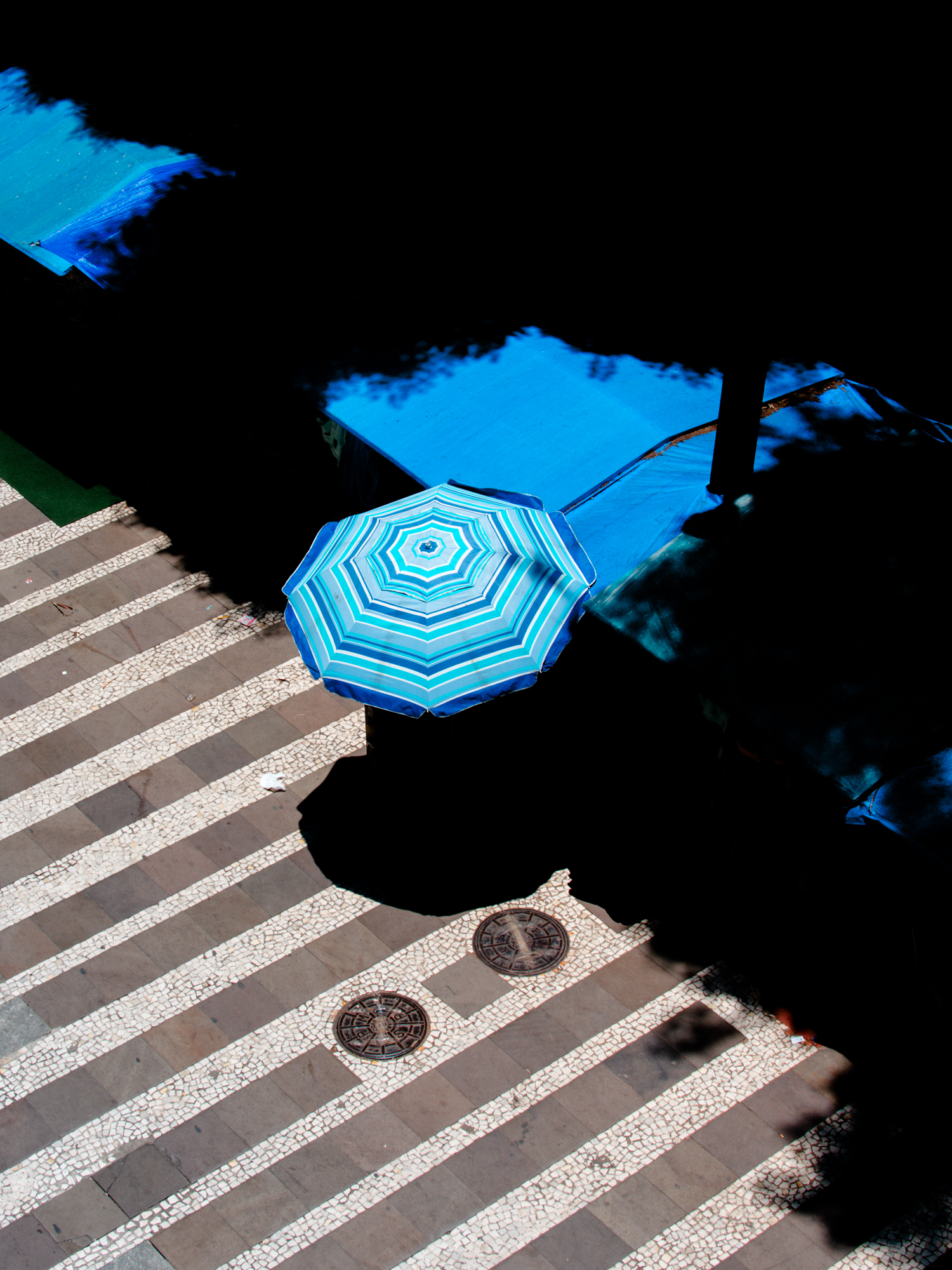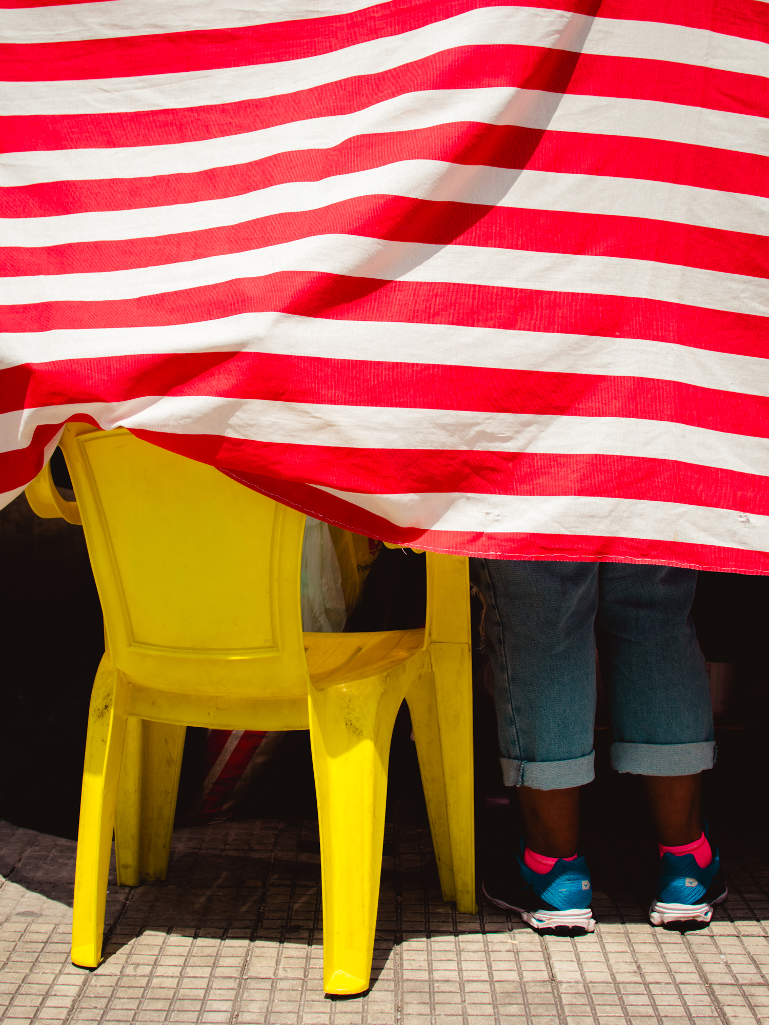 Rafa doesn’t argue against this directly. He simply looks elsewhere. The series builds itself through fragments: a figure sitting under a red-striped umbrella, absorbed in a moment that feels both ordinary and strangely isolated; a burst of mural color interrupted by shadow, where visibility itself becomes unstable; a passing gesture against an orange wall, where the city’s surfaces begin to speak louder than its structures. These are not grand statements. They are interruptions.