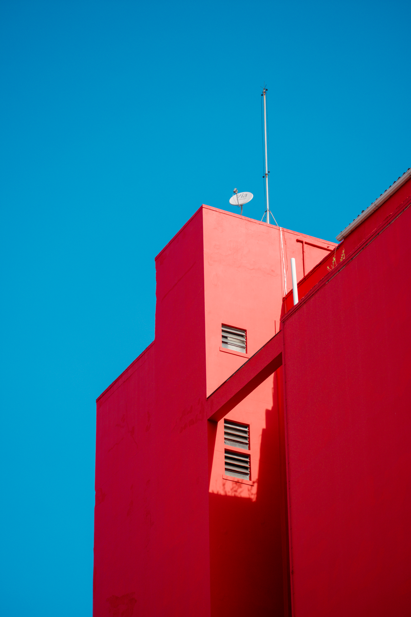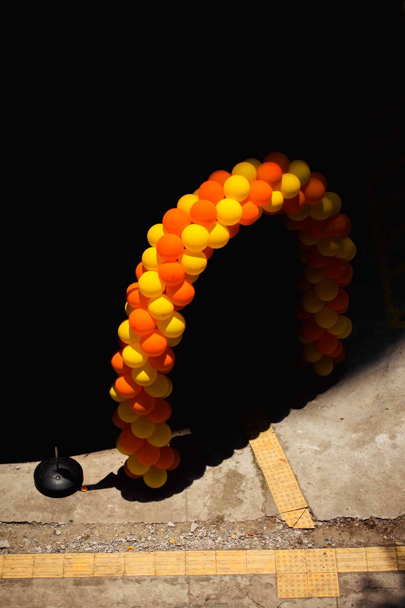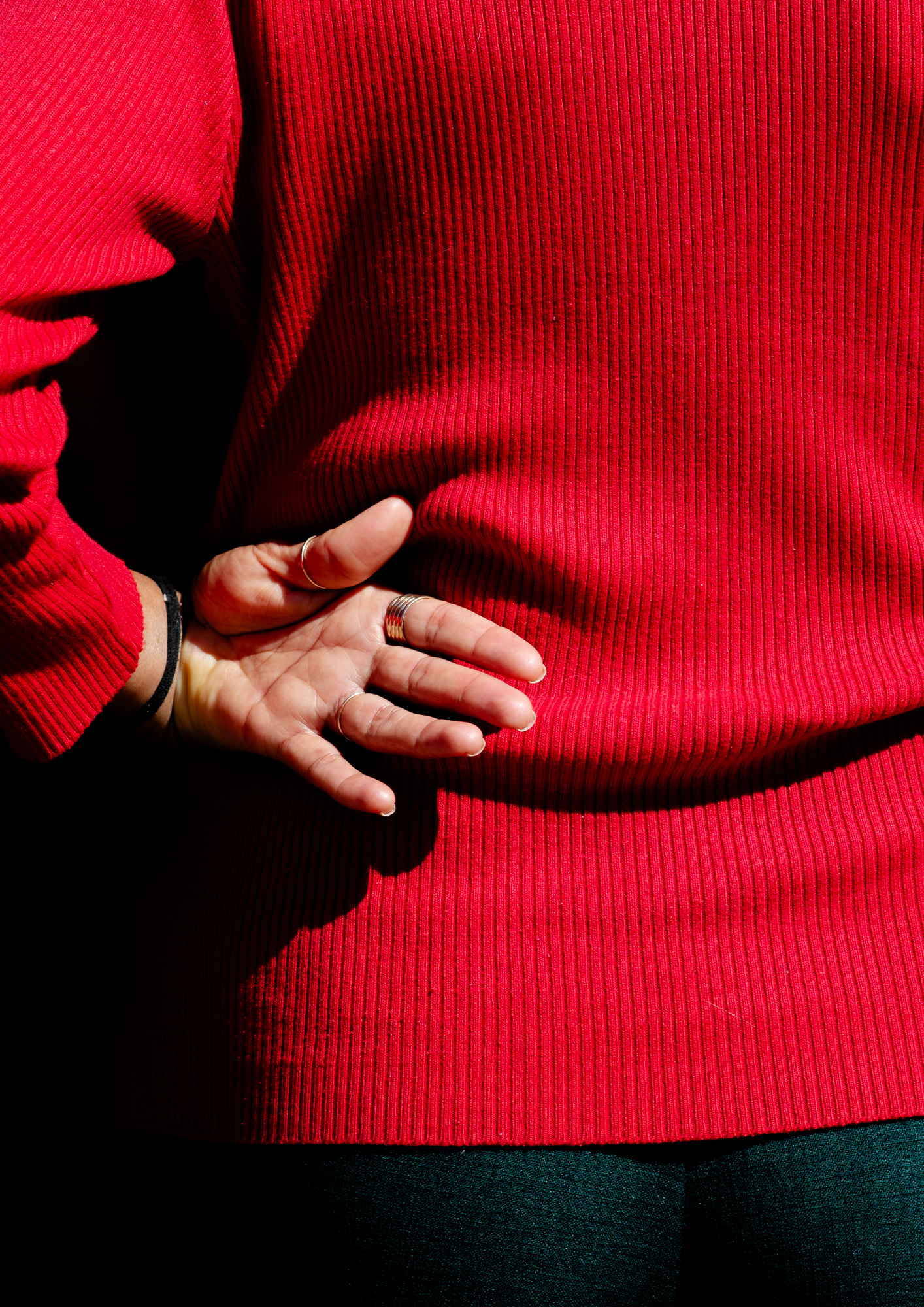 Rafa doesn’t argue against this directly. He simply looks elsewhere. The series builds itself through fragments: a figure sitting under a red-striped umbrella, absorbed in a moment that feels both ordinary and strangely isolated; a burst of mural color interrupted by shadow, where visibility itself becomes unstable; a passing gesture against an orange wall, where the city’s surfaces begin to speak louder than its structures. These are not grand statements. They are interruptions.